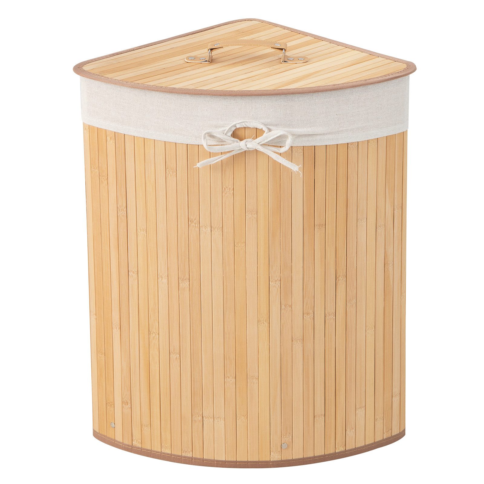 Dieser Wäschesammler hat eine einzigartige Form und passt in jede Ecke im Raum. Er eignet sich für die meisten kleinen Badezimmer, Waschküchen, Schränke und mehr. Dieser Wäschekorb besteht aus natürlichem Bambusmaterial, das erneuerbar und umweltfreundlich ist. Außerdem ist er mit einem abnehmbaren Deckel und einem maschinenwaschbaren Innenbeutel ausgestattet. Bei Nichtgebrauch können Sie den Wäschesammler einfach zerlegen und auf eine kompakte Размер zusammenklappen.