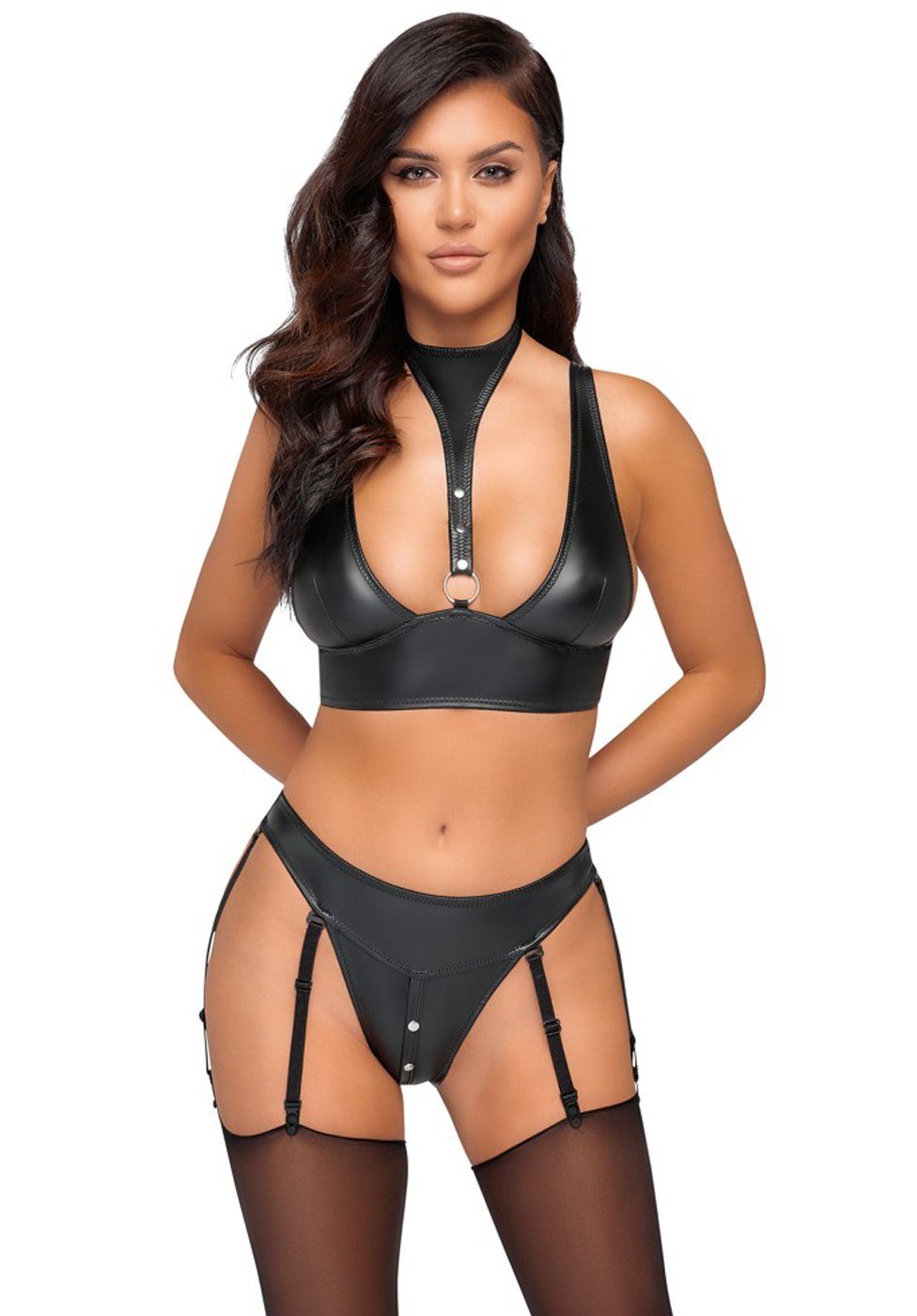 Bralette und Straps-Slip im Set von Cottelli im edlen schwarzen Mattlook mit silberfarbenen Details. Bralette im tiefen Dekolleté mit Ring und Steg bis zum Halsband mit verstellbarem Druckknopf-Verschluss im Nacken. Die breiten Träger teilen sich im Rücken in 4 schmale Träger und sind jeweils passend verstellbar. Taillenhoch geschnittener Straps-Slip mit Druckknopf-Schrittverschluss bis über den Po. Für fesselnde Lustmomente ist hinten am Slip-Bund eine softe Manschette fest angenäht. Die verstellbaren Strumpfhalter sind vom Slip abnehmbar.
