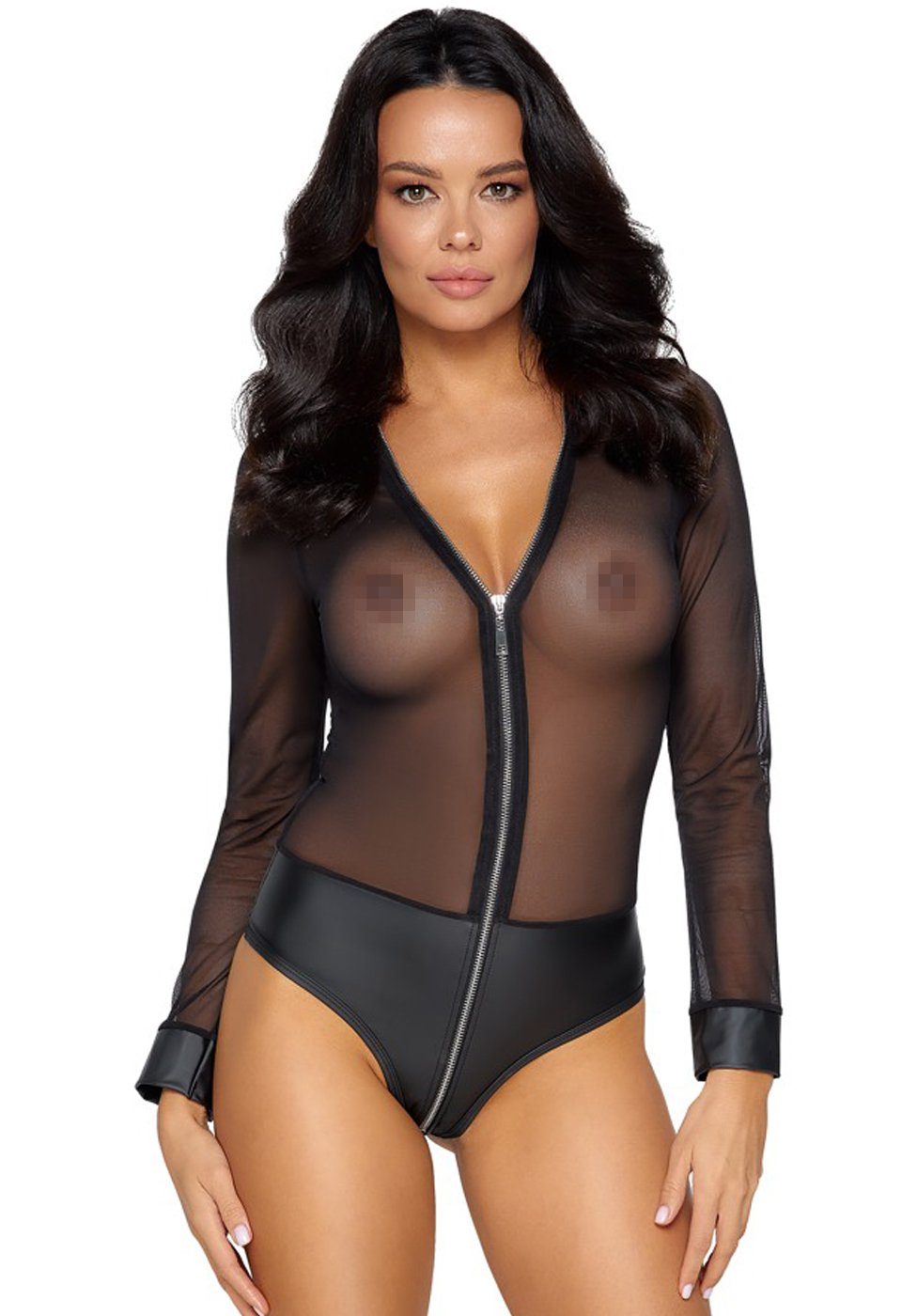 Transparenter Langarm-Body von Cottelli PARTY aus feinem Powernet mit blickdichtem Höschenteil im edlen Mattlook. Ärmelbündchen ebenfalls im Mattlook. Rundum weich und elastisch für hohen hautnahen Tragekomfort. Der lange silberfarbene, praktisch erotische Reißverschluss verläuft vorne vom Hals bis in den Schritt.