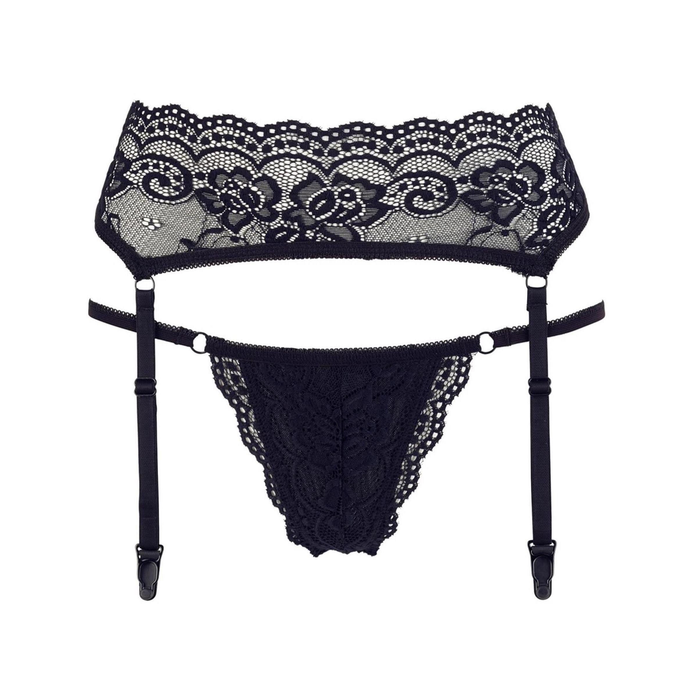 Edles Lingerie-Set aus elastischer Spitze. Inklusive einem knapp geschnittenen String mit elastischen Bändern und einem Strapsgurt mit verstellbaren Strumpfhaltern. Ohne Strümpfe.