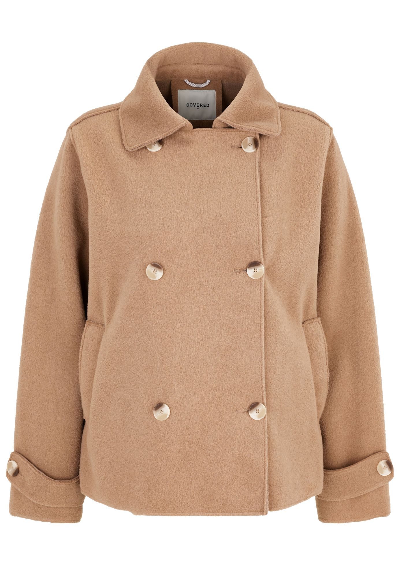 Besondere Merkmale | Zweireiher mit Knöpfen, Wollmantel-Optik, offene Kantenverarbeitung |