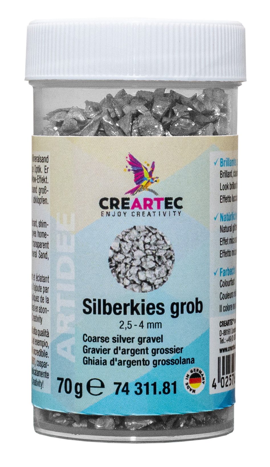 Dieser Silberkies lässt sich einfach auf die noch feuchte Farbe oder Kleber streuen. So erhalten Bastelprojekte aus Glas, Beton oder Holz ein glänzendes Aussehen. Das gefärbte Glasgranulat sollte in keiner Bastelkiste fehlen.