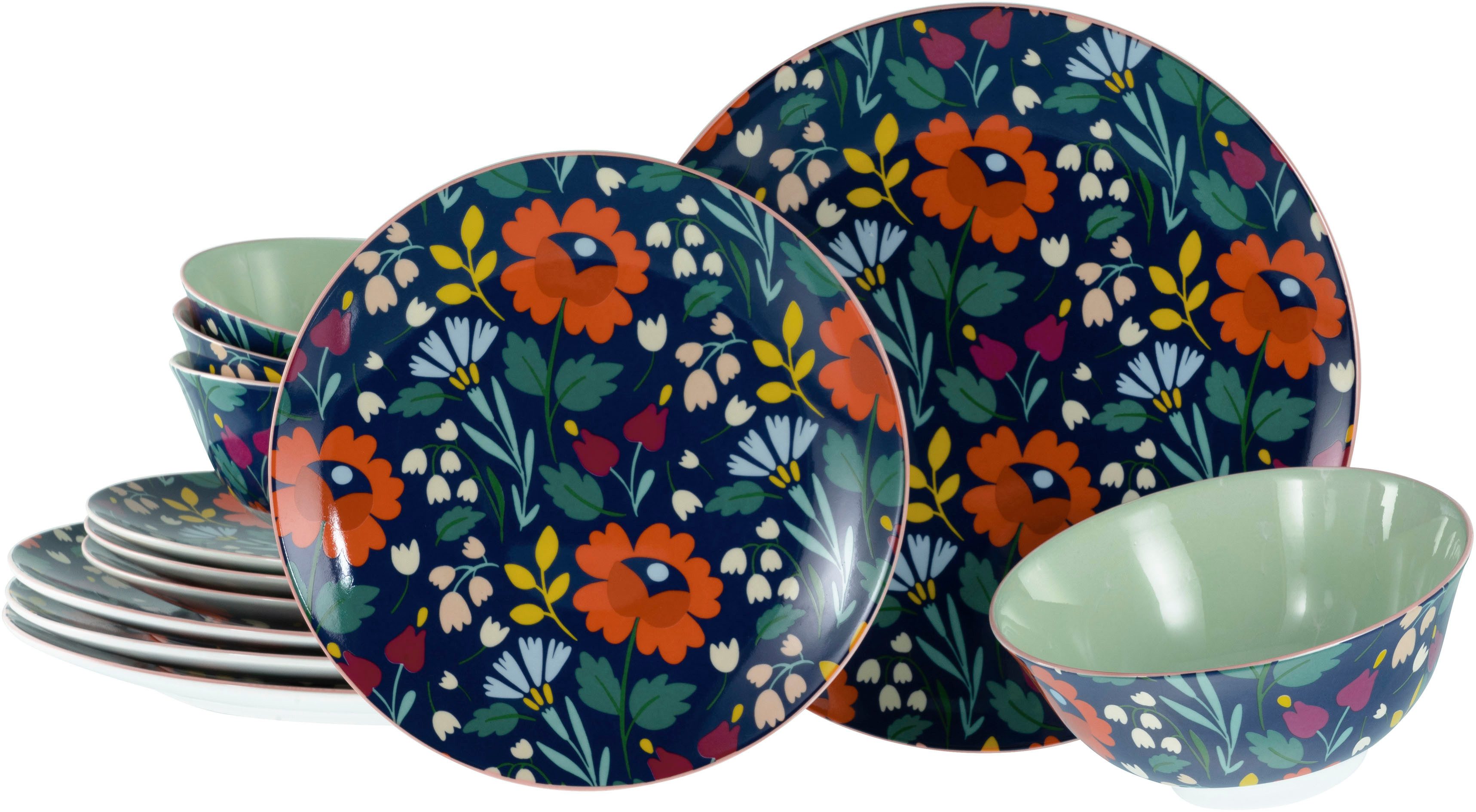 EDLES TELLERSET: 12 außergewöhnliche Stücke, bereit, deinen Tisch zu schmücken. Das Set beinhaltet 4 Speiseteller (Ø 25 cm), 4 Dessertteller (Ø 22 cm) und 4 Mehrzweckschalen (Ø 15 cm). FRÖHLICHES DESIGN: Herrlich buntes, vollflächig dekoriertes Geschirr mit skandinavischen Blumen im modernen Zeichenstil. GUTEN MORGEN: So kann der Tag beginnen! Bunte Farben, blaue Grundfarbe und die Becher und Müslischalen sind jeweils innen grün lasiert mit zusätzlichen Motiven. FREUDE: Das Geschirr begleitet Dich durch den ganzen Tag. Es ist außergewöhnlich lang haltbar und selbstverständlich auch spülmaschinen- und mikrowellengeeignet. MARKENQUALITÄT: Unser Geschirr wird in Deutschland konzipiert und in ausgewählten Premiumfabriken produziert, um Dir die Qualität zu liefern, die Du Dir für Dein Zuhause wünschst. Außerdem ist für Bruchersatz in der Regel zeitnah und jahrelang gesorgt!
