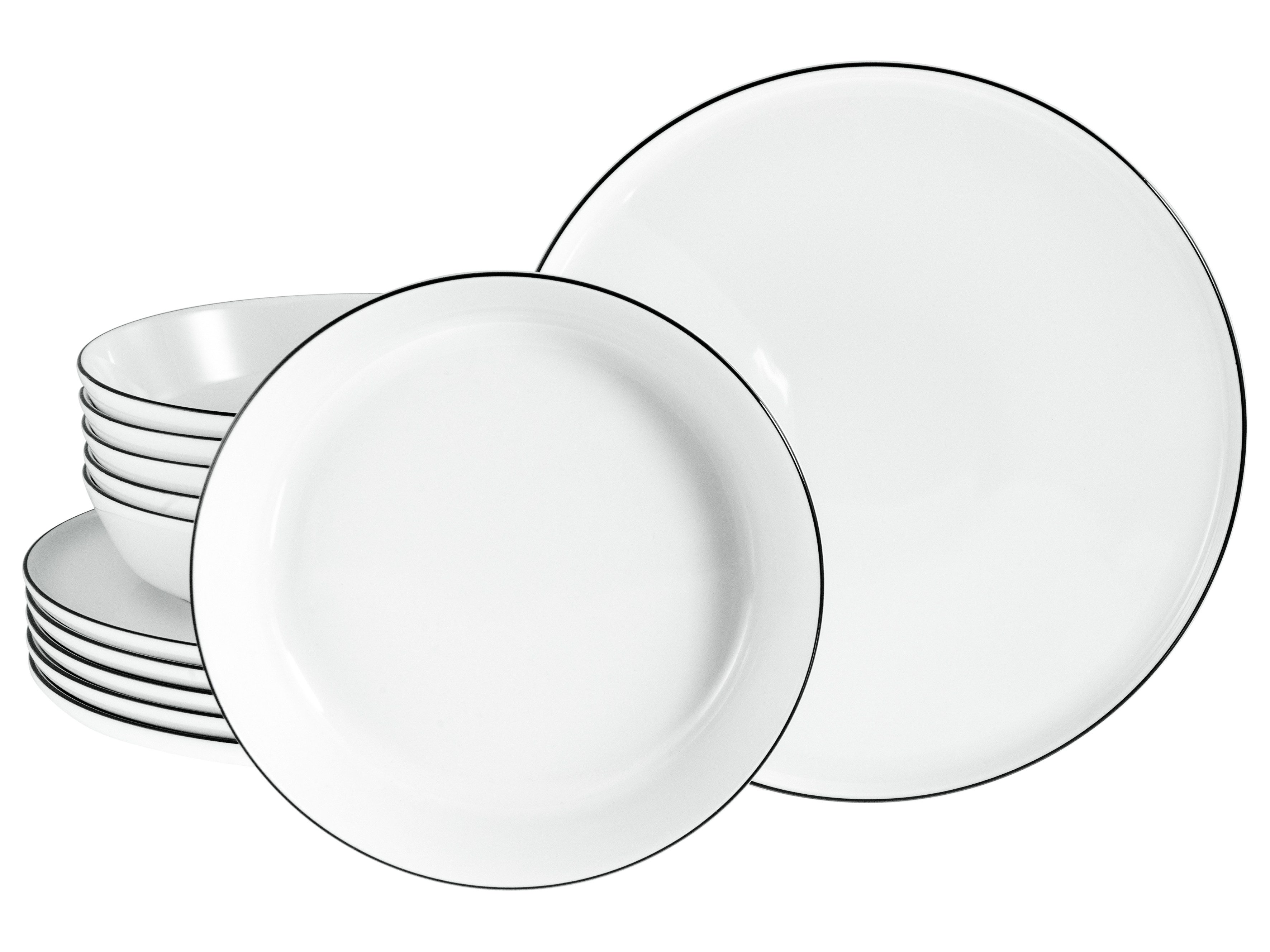 EDLES TELLERSET: 12 außergewöhnliche Stücke, bereit deinen Tisch zu schmücken. Das Set beinhaltet 6 Speiseteller (Ø 26 cm) und 6 Suppenteller (Ø 20 cm). DESIGNKLASSIKER: Moderne Formensprache mit sehr flachen Tellern im Material (Porzellan aus einer europäischen Premiumproduktion) und im Design mit einer fein gearbeiteten schwarzen Linie. DER ALLESKÖNNER: Beliebig mit anderem Geschirr kombinierbar, modern & frisch im Auftritt und darüber hinaus auch noch sinnvoll erweiterbar. Einfach nur klassisch schön! FREUDE: Das Geschirr begleitet Dich durch den ganzen Tag. Es ist außergewöhnlich lang haltbar und selbstverständlich auch spülmaschinen- und mikrowellengeeignet. MARKENQUALITÄT: Unser Geschirr wird in Deutschland konzipiert und in ausgewählten Premiumfabriken produziert, um Dir die Qualität zu liefern, die Du Dir für Dein Zuhause wünschst. Außerdem ist für Bruchersatz in der Regel zeitnah und jahrelang gesorgt!