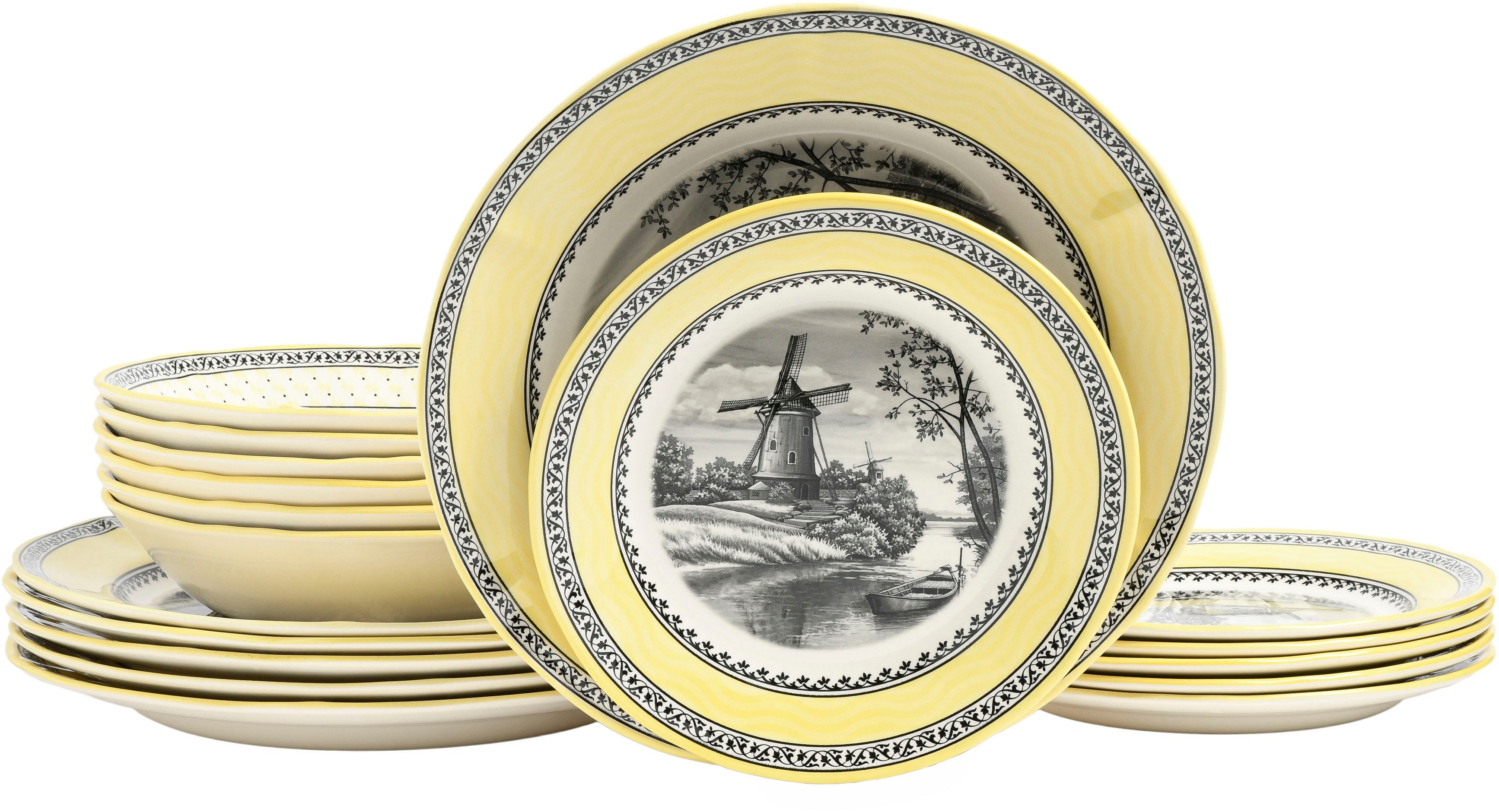 EDLES TELLERSET: 18 Designerstücke warten darauf, Deinen Tisch zu schmücken. Das 18 teilige Service beinhaltet 6 Speiseteller (Ø 26,5 cm), 6 Suppenteller (Ø 20 cm) und 6 Dessertteller (Ø 21 cm). KLASSIKER IM TREND: Klassisches, traditionelles Geschirrmotiv, zeitlos schön und typisch für den Manufaktur Charakter. DESIGN IM TREND: Windmühlen Nostalgie in edlem Grau-Gelb mit Stempelkante, traditionell und doch modern. FREUDE: Das Geschirr begleitet Dich durch den ganzen Tag. Es ist außergewöhnlich lang haltbar und selbstverständlich auch spülmaschinen- und mikrowellengeeignet. MARKENQUALITÄT: Unser Geschirr wird in Deutschland konzipiert und in ausgewählten Premiumfabriken produziert, um Dir die Qualität zu liefern, die Du Dir für Dein Zuhause wünschst. Außerdem ist für Bruchersatz in der Regel zeitnah und jahrelang gesorgt!