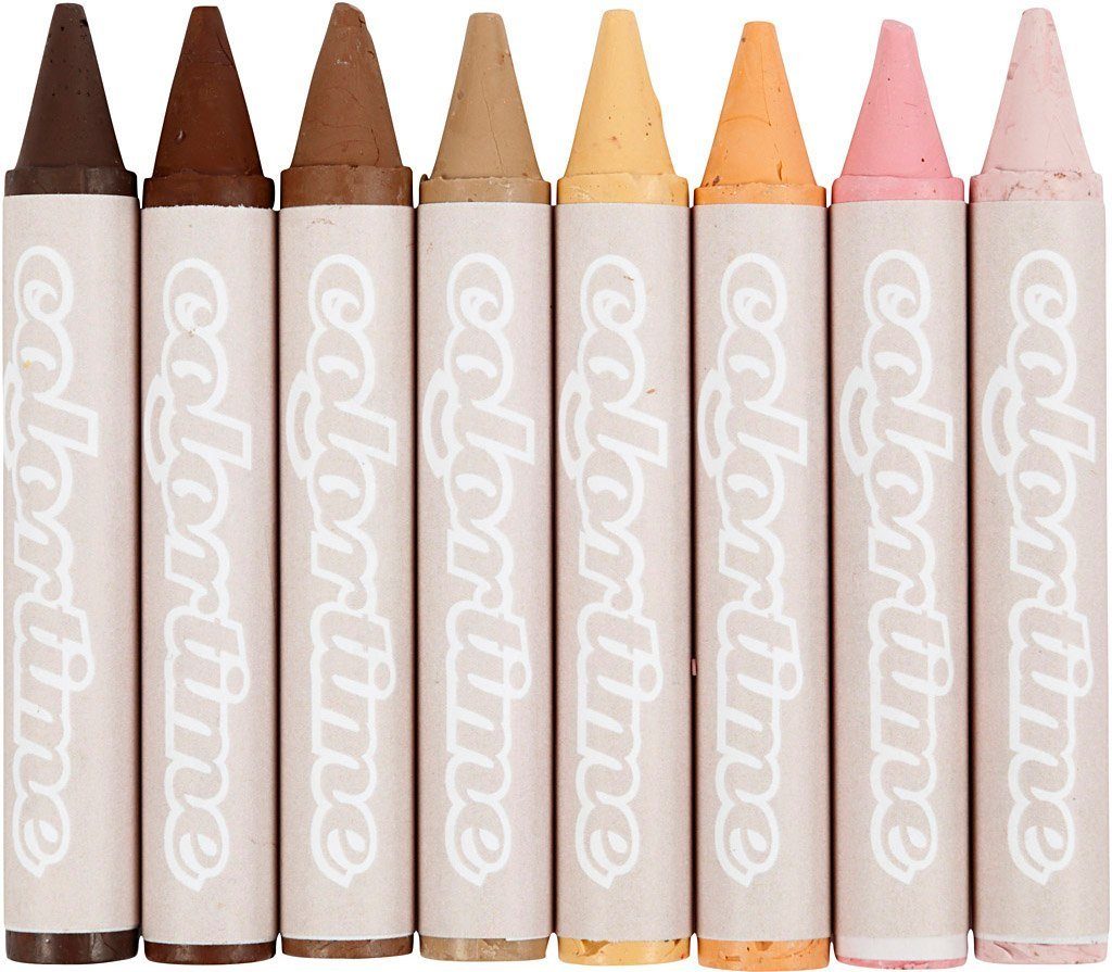 Wachsmalstifte 'Natur', 8 Stück mit einer Длина von ca. 10 cm und einem Ø von ca. 15 mm. Die Farbpalette reicht von sehr hellem Beige/Rosa bis hin zu Dunkelbraun, sodass sich viele verschiedene Hauttöne gestalten lassen. Die Stifte sind mit Papier umwickelt, benutzerfreundlich und für Kinder geeignet.
