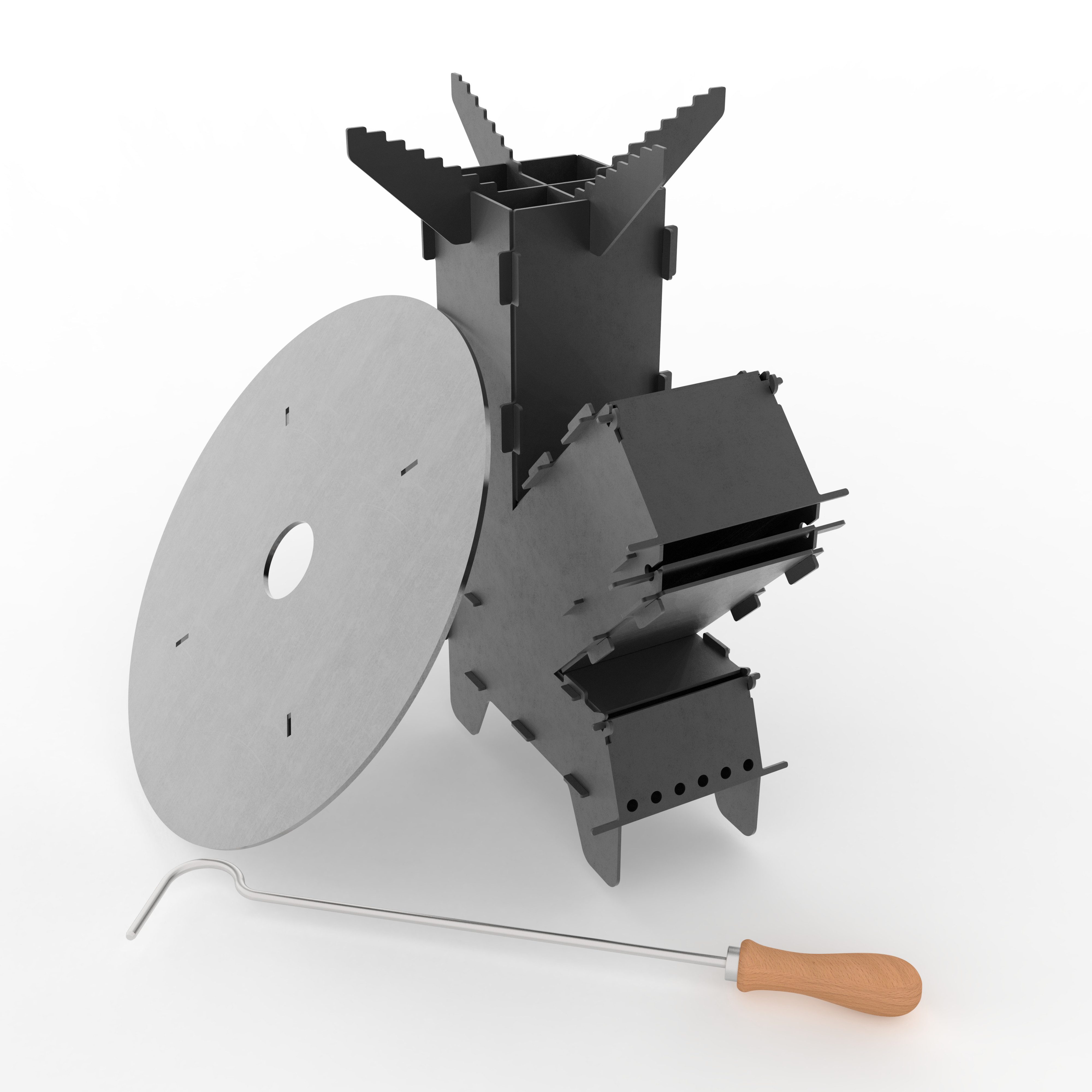 KOMPAKTES STECKSYSTEM: Das innovative Stecksystem erlaubt eine platzsparende Lagerung und einfache Montage, was den Raketenofen besonders benutzerfreundlich macht.