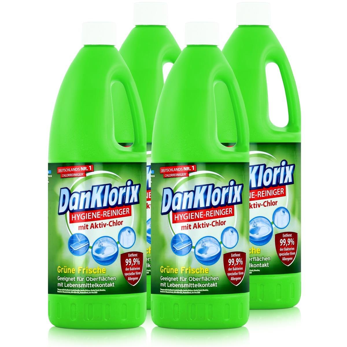 Frisch und sauber bleiben mit dem DanKlorix Hygienereiniger Grüne Frische 1,5 Liter reine Reinigungskraft in einer Flasche! Der DanKlorix Hygienereiniger Grüne Frische ist die Lösung für alle Ihre Reinigungsprobleme. Verabschieden Sie sich von scharfen Chemikalien und freuen Sie sich auf ein sauberes, frisches Zuhause. Dieser Allzweckreiniger eignet sich für alle Oberflächen, die mit Lebensmitteln in Berührung kommen, und ist somit die perfekte Ergänzung zu Ihrem Reinigungsarsenal. DanKlorix Hygienereiniger Grüne Frische wird mit natürlichen Inhaltsstoffen hergestellt und ist somit sicher für Sie, Ihre Familie und die Umwelt. Seine grüne Frischeformel sorgt für einen sauberen und erfrischenden Duft, der Ihr Zuhause frisch und sauber erscheinen lässt. Verabschieden Sie sich von aggressiven Chemikalien und freuen Sie sich auf eine saubere, natürliche und sichere Lösung. DanKlorix Hygienereiniger Grüne Frische - Leicht in der Anwendung Mit seinen benutzerfreundlichen Anwendungshinweisen ist der DanKlorix Hygienereiniger Grüne Frische leicht zu verwenden. Sprühen Sie den Reiniger einfach auf die Oberfläche, lassen Sie ihn eine Minute einwirken und wischen Sie ihn dann mit einem sauberen Tuch weg. In den Anwendungstipps finden Sie nützliche Hinweise, wie Sie Ihren Reiniger optimal nutzen können. Mit DanKlorix Hygienereiniger Grüne Frische war die Reinigung noch nie so einfach. DanKlorix Hygienereiniger Grüne Frische : Geeignet für alle Oberflächen mit Lebensmittelkontakt DanKlorix Hygienereiniger Grüne Frische eignet sich perfekt für alle Oberflächen, die mit Lebensmitteln in Berührung kommen, und ist somit eine vielseitige Lösung für Ihr Zuhause. Verwenden Sie ihn in Ihrer Küche, um Arbeitsflächen, Spülen und Geräte zu reinigen, oder in Ihrem Badezimmer, um Fliesen, Duschen und Toiletten zu reinigen. Dieser Reiniger eignet sich perfekt für alle Oberflächen, die mit Lebensmitteln in Berührung kommen, und ist somit ein Muss für jeden Haushalt. Zusammenfassend lässt sich sagen, dass DanKlorix Hygienereiniger Grüne Frische eine natürliche, sichere und effektive Lösung für Ihre Reinigungsbedürfnisse ist. Mit seinen benutzerfreundlichen Anwendungshinweisen, der vielseitigen Anwendung und der grünen Frischeformel ist dieser Reiniger ein Muss für jeden Haushalt. Also fügen Sie DanKlorix Hygienereiniger Grüne Frische noch heute zu Ihrem Reinigungsarsenal hinzu und genießen Sie ein sauberes und frisches Zuhause. Im Lieferumfang enthalten: DanKlorix Hygiene-Reiniger Grüne Frische 1,5 Liter 4er PackInhaltsstoffe | Unter 5% Bleichmittel auf Chlorbasis, Duftstoffe, Wirkstoff: 2,8g Natriumhypochlorit per 100 g Flüssigkeit |