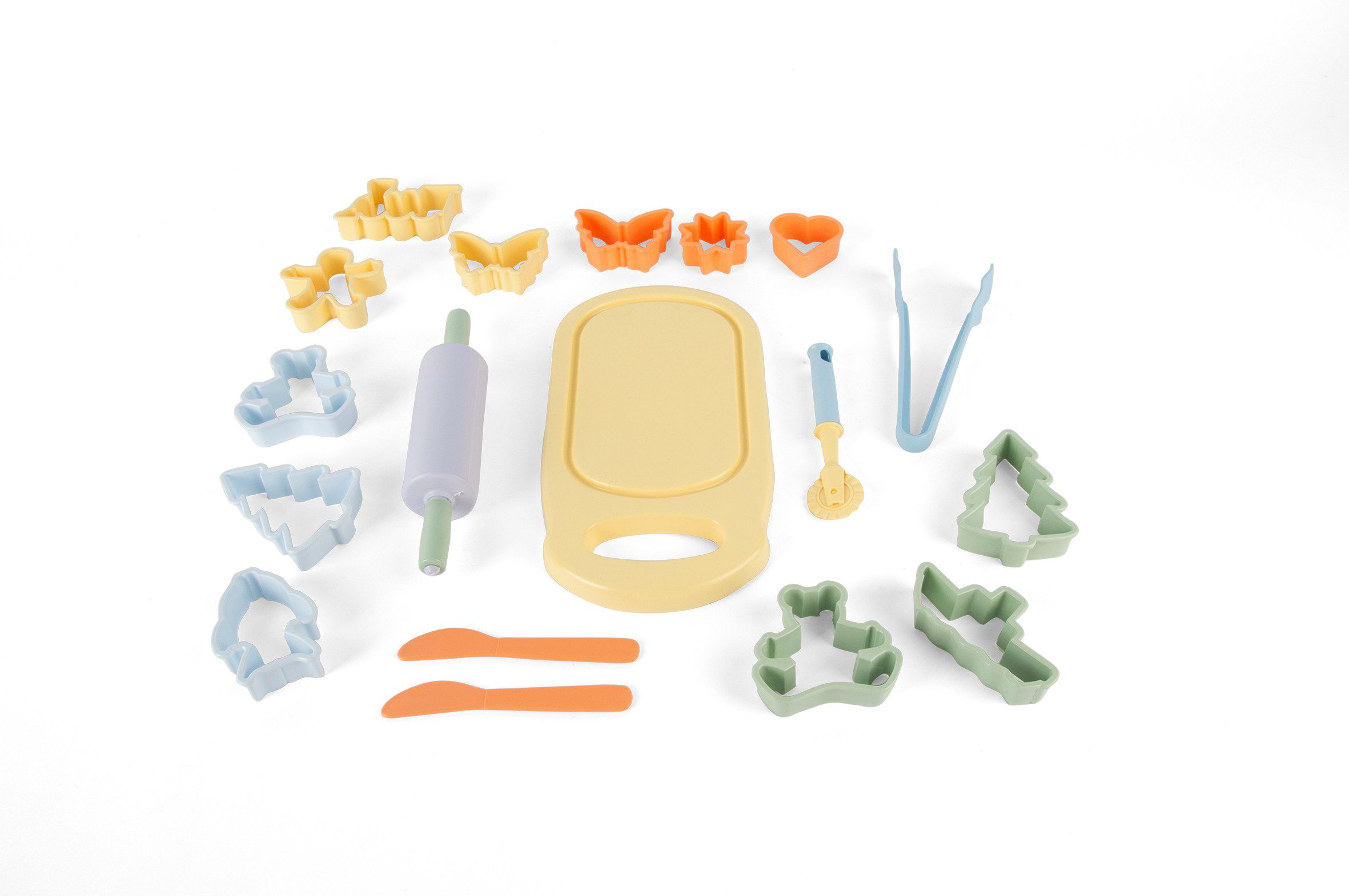 Das Set enthält verschiedene Formen, Rollen und Modelliertools in harmonischen Pastell- und Orangetönen, die Ihrem Kind endlose Möglichkeiten bieten, seine Kreativität zu entfalten. Die verschiedenen Werkzeuge sind speziell für kleine Kinderhände entwickelt und helfen bei der Entwicklung der Feinmotorik und Auge-Hand-Koordination.