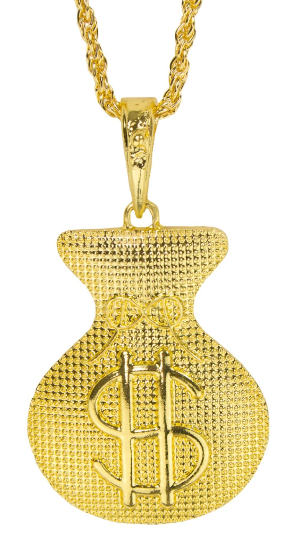 Goldene Halskette mit glitzerndem Dollarzeichen & Geldsack-Anhänger – perfektes Accessoire für Pimp-, Rapper-, Mafia- oder Disco-Kostüme