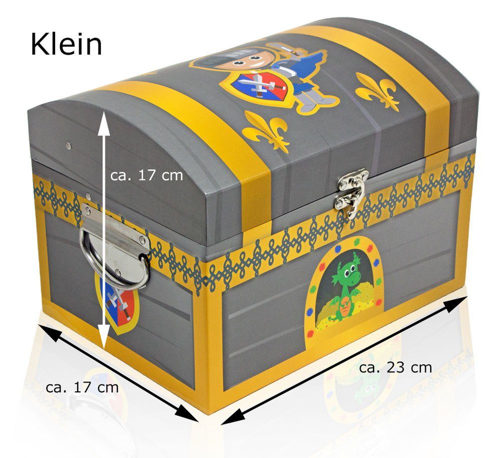 Was wäre eine Kinder Geburtstagsparty ohne das passende Party Thema? Mit diesen tollen Ritter Schatzkisten haben Sie eine tolle Überraschung für das Geburtstagskind und auch ein perfektes Geschenk für die kleinen Besucher. Veranstalten Sie doch einmal eine Mittelalter Geburtstagsparty und überraschen die kleinen Gäste mit diesen süßen Schatztruhen. Vorab darf natürlich die entsprechende Schatzsuche nicht fehlen und die kleinen und großen Schatzkisten lassen sich prima mit Süßigkeiten füllen. Mit einer dieser Schatztruhen können Sie Ihren kleinen Ritter ganz bestimmt überraschen und auch für das Geschenk für ein Hochzeitspaar oder als Geschenkverpackung sind diese Schatztruhen eine tolle Idee! Eine tolle Kiste zum Verschenken oder Schätze aufbewahren, die nicht nur aus Goldmünzen bestehen müssen! Die Boxen gibt es in drei verschiedenen Größen, sie sind aus stabilen Pappmaterial hergestellt. Durch den Holzdruck und die verschiedenen Figuren wie Drachen, Ritter und Lilien sieht die Truhe besonders toll aus! Mit den an den Seiten angebrachten Metallhenkeln lässt sich die Schatzkiste auch im vollen Zustand leicht in das nächstbeste Versteck tragen. Besonders praktisch ist vorn der kleine Metallverschluss, so dass der Schatz auch vor diebischen Räubern geschützt wird. Ein kleiner Tipp: Diese Schatzkisten sind nicht nur was für kleine Ritter, sie kommen auch super bei erwachsenen Geburtstagskindern oder dem Brautpaar an!