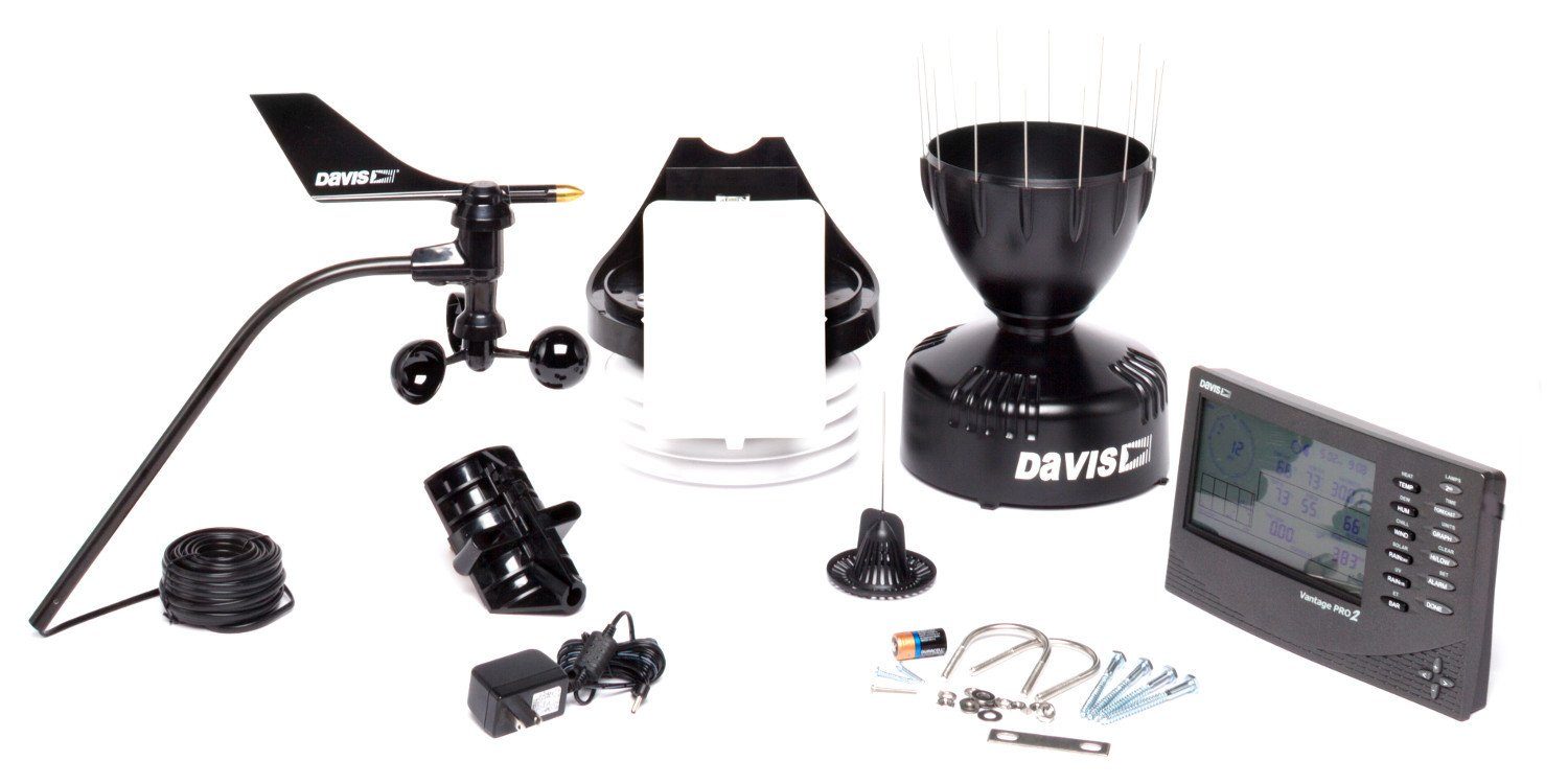 Die Wetterstation Davis Vantage Pro 2 Kabel besteht aus einem hochwertigen Display und einer kombinierten Außeneinheit. Dieses Kombi-Instrument misst über einen sehr großen Regenmessbehälter den Niederschlag und mit einem extrem genauen Windmesser die Windrichtung und -geschwindigkeit. Temperatur und Luftfeuchtigkeit werden in einem geschützten, gut belüfteten Gehäuse gemessen. Die Daten des Kombi-Außensensors werden über ein 30 Meter langes Kabel zur Basis der Wetterstation übertragen. Dieses Kabel kann auf eine Gesamtlänge von 300 Meter verlängert werden. Die Wetterstation wurde für Kunden entwickelt, die keine Funkübertragung möchten, bzw. in Gebieten leben in denen starke Störstrahlungen auftreten.