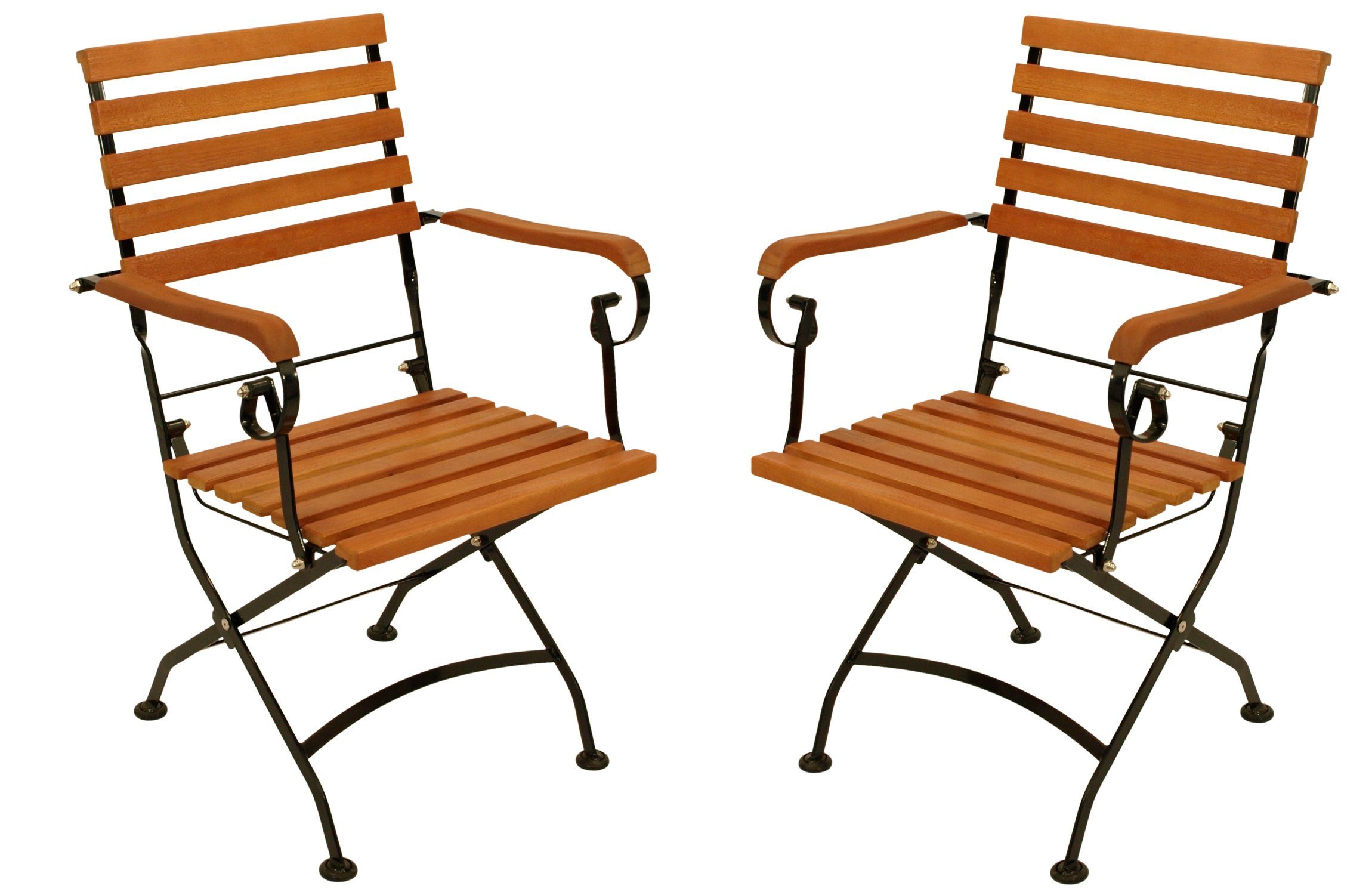 2x eleganter Klappsessel SCHLOSSGARTEN mit Armlehnen. Stabiles Flachstahl - Gestell in schwarz, Belattung aus Eukalyptus Holz. Die hier angebotenen Sessel sind klappbar und können dadurch platzsparend eingelagert werden (z.B. im Winter). Das Gestell wird aus stabilem Flachstahl gefertigt, schwarz pulverbeschichtet. Die Belattung besteht aus edlem Eukalyptus - Hartholz (geölt). Eukalyptuholz ist sehr widerstandsfähig und pflegeleicht - es braucht nicht nachgestrichen zu werden, regelmäßige Behandlung mit einem Pflegeöl ist ausreichend. Maße: Sitzbreite: 45cm Sitzhöhe: 45cm (vorne) bzw. 41cm (hinten) Sitztiefe: 39cm Rückenhöhe: 49cm Höhe gesamt: 87cm Breite gesamt: 56cm Tiefe gesamt: 57cm Unterschubhöhe: 67,5cm Maße geklappt: 115x19x56cm An den Füßen sind widerstandsfähige Kunststoff-Bodenschoner angebracht. Sie können die Möbel so problemlos auch auf empindlichen Böden wie Fliesen oder Holz verwenden, ohne Kratzer oder Farbspuren zu verursachen. Das Angebot bezieht sich auf ZWEI Stück Klappstühle (VE = 2 Stück im Karton).