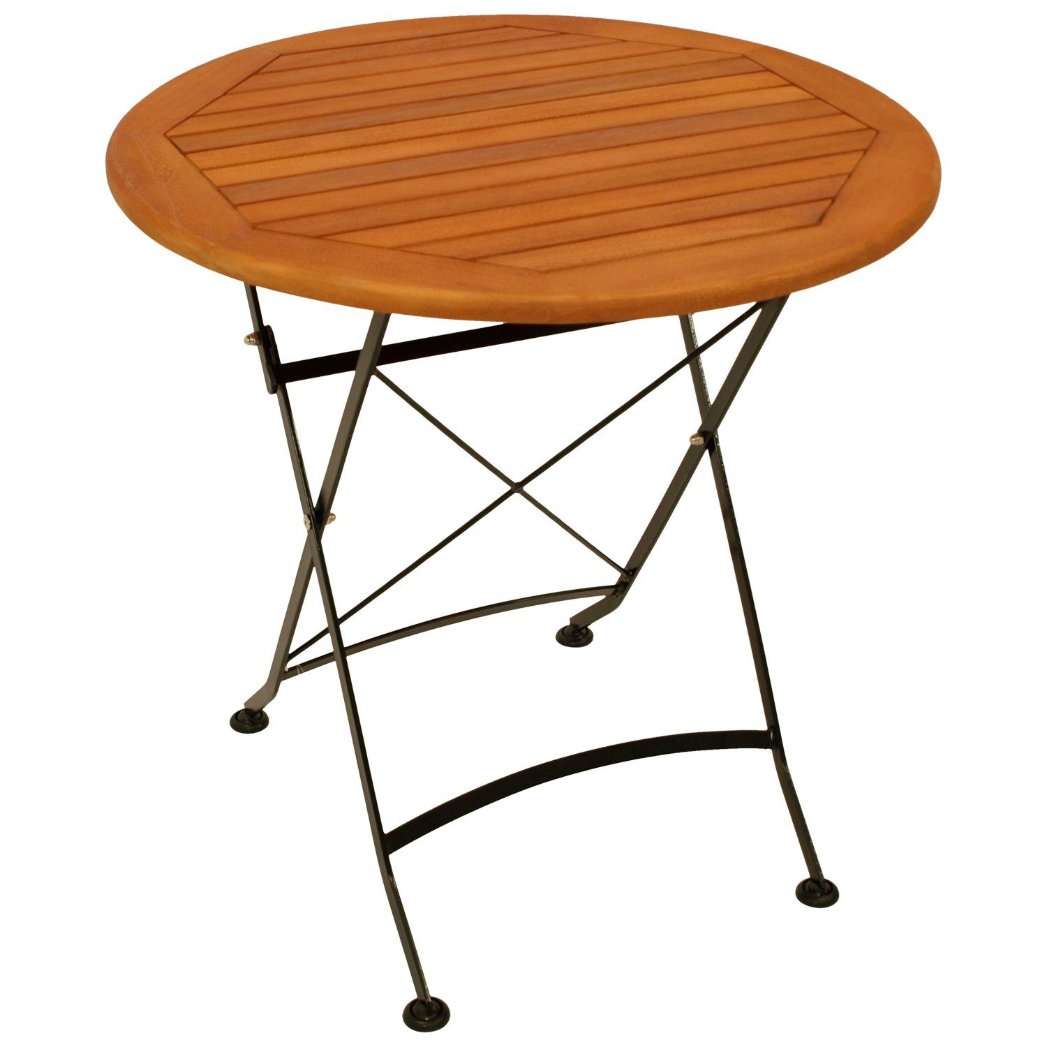 Eleganter Klapptisch HOFGARTEN, runde Form mit 75cm Durchmesser. Stabiles Flachstahl -Gestell. Belattung aus Eukalyptus Holz. Die hier angebotenen Gartentische sind klappbar und können dadurch platzsparend eingelagert werden (z.B. im Winter). Das Gestell wird aus stabilem Flachstahl gefertigt, schwarz pulverbeschichtet. Die Belattung besteht aus edlem Eukalyptus - Hartholz (geölt). Eukalyptus - Holz ist sehr widerstandsfähig und pflegeleicht - es braucht nicht nachgestrichen zu werden, regelmäßige Behandlung mit einem Pflegeöl ist ausreichend. Maße: Durchmesser 75cm Höhe 75cm Unterschubhöhe 73cm An den Füßen sind widerstandsfähige Kunststoff-Bodenschoner angebracht. Sie können die Möbel so problemlos auch auf empindlichen Böden wie Fliesen oder Holz verwenden, ohne Kratzer oder Farbspuren zu verursachen.
