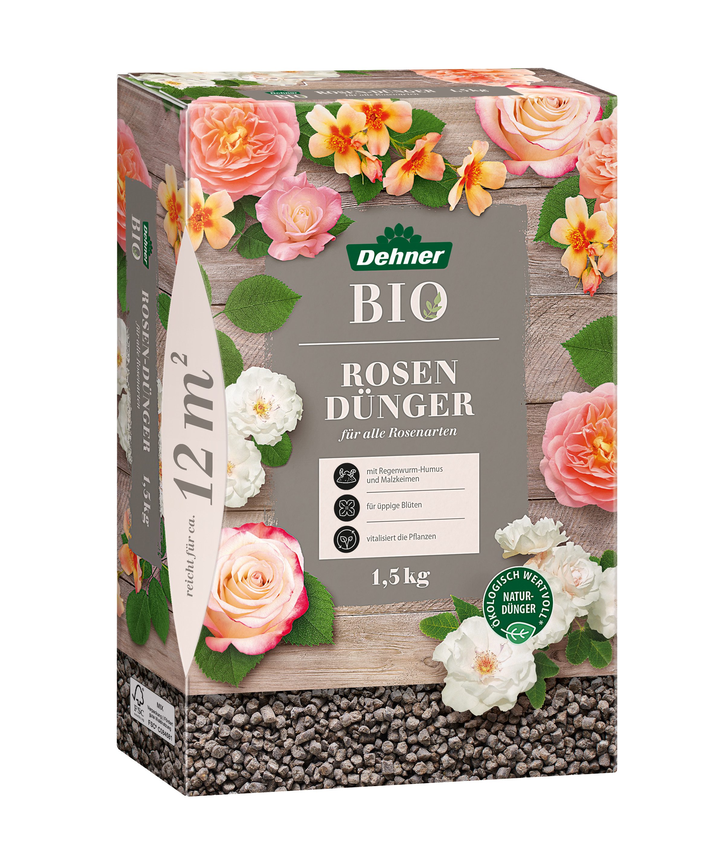 Bei dem Dehner Bio Rosen-Dünger handelt es sich um einen hochwertigen, organischen NPK-Dünger, der in seiner Zusammensetzung speziell auf die besonderen Bedürfnisse von Rosenpflanzen abgestimmt ist. Neben Regenwurmhumus und Malzkeimen enthält der Dehner Bio Rosen-Dünger: Stickstoff (N) für die allgemein gute Entwicklung der Pflanzen, Phosphat (P) für die reiche Blütenbildung und Kalium (K), das für insgesamt gesündere, gut entwickelte und robuste Pflanzen sorgt. Die 1,5 kg Packung reicht für ca. 12 m², als ideale Menge pro m² empfehlen unsere Gärtner 120-150 g. Neben der Düngung beim Pflanzen sollten Sie Ihre Rosenpflanzen 2-4 Mal pro Jahr mit dem ausgewogenen Nährstoffmix von Dehner Bio Rosen-Dünger versorgen.