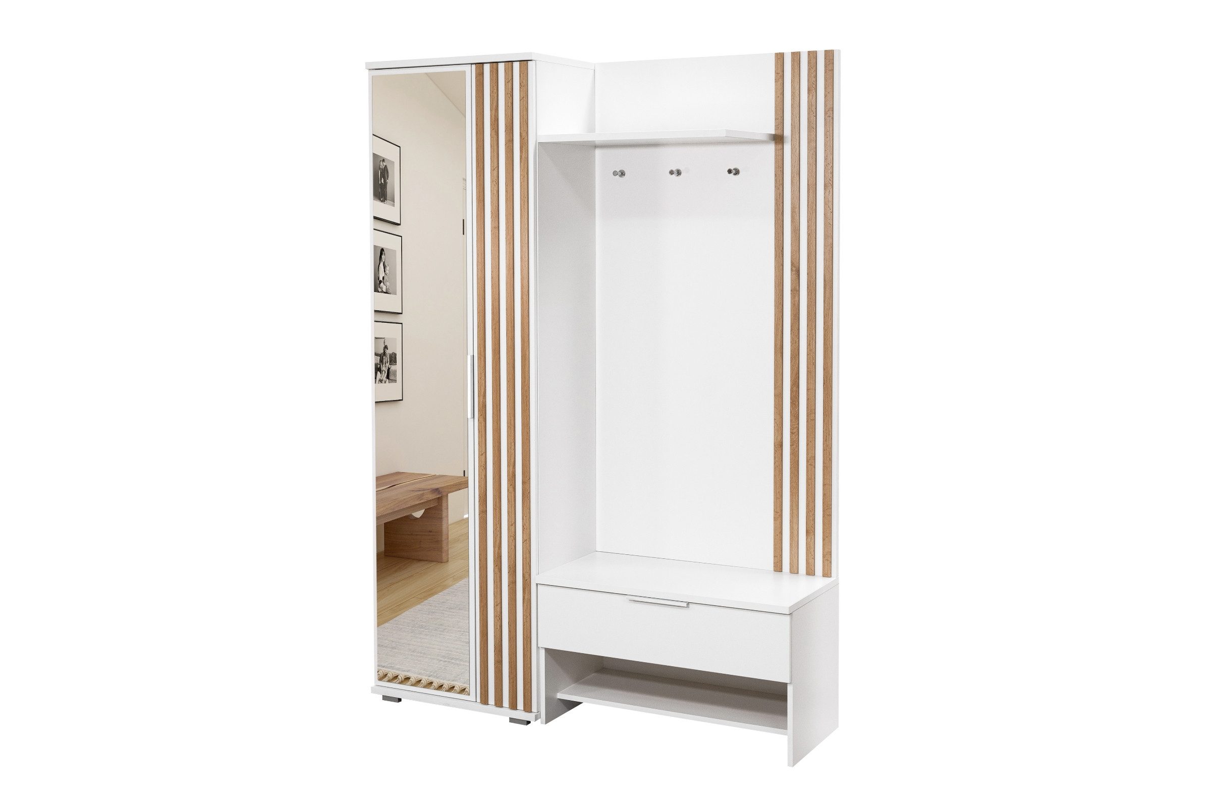 Kompakte Garderobe mit Spiegel in mehreren Farben verfügbar, optional mit Lamellen. Hier finden Schuhe, Schlüssel und Jacken garantiert einen Platz, dank der zahlreichen Stauraummöglichkeiten.