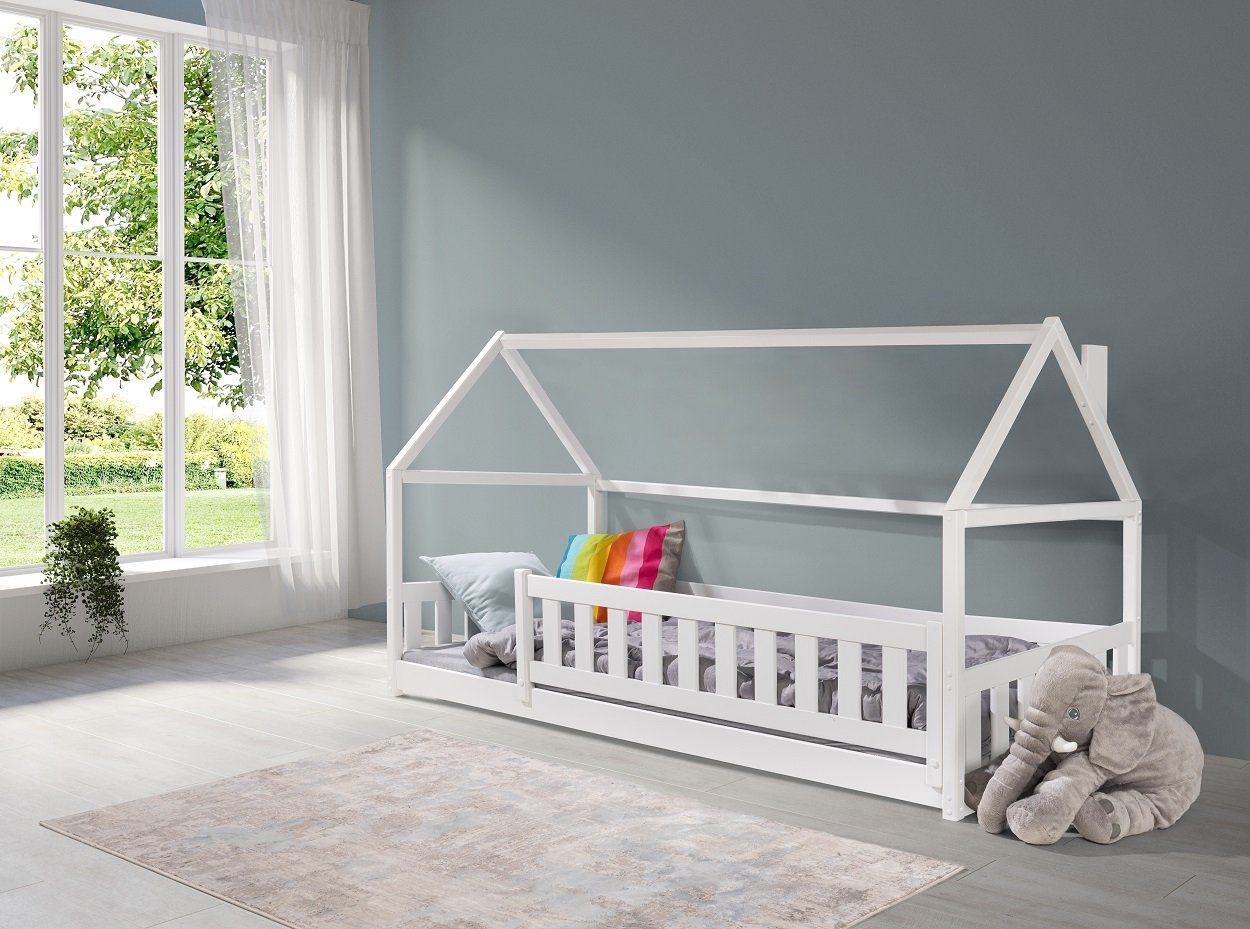 Kinderbett Hausbett für 1 Kind ELLA 80x180 / 90x200 / 120x200 / 140x200 cm Unser Hausbett ELLA wird nach unseren Prinzipien angefertigt – die Matratze befindet sich niedrig über dem Boden. Ihr Kind kann selbständig hinein- und heraussteigen, ohne das Risiko, sich zu verletzen oder herunterzufallen. Die ungewöhnliche Form sorgt dafür, dass Kinder das Hausbett nicht nur nachts, sondern auch tagsüber sehr gerne nutzen, weil es ein hervorragender Ort für kreatives Spielen ist. Wenn es Ihnen daran liegt, dass Ihr Kind in seinem eigenen Zimmer schläft, ist unser Hausbett perfekte Auswahl um das Kind zu ermutigen, das Schlafen in seinem eigenen Zimmer zu akzeptieren. Die Bettkonstruktion bietet zahlreiche Möglichkeiten es zu dekorieren, also lassen Sie Ihrer Fantasie freien Lauf und machen Sie es zu einem gemütlichen und sicheren Schlafplatz, den Ihr Kind gerne nutzt. Unser Hausbett ELLA wird aus Kiefernholz angefertigt. Natürliches Material, solide Konstruktion und präzise Verarbeitung garantieren eine sichere und dauerhafte Nutzung des Bettchen für viele, viele Jahre. Dank einem stabilen abnehmbaren Rausfallschutz wird Ihr Liebling während des Schlafs oder des Spieles geschützt. Das Bett ist in weiß und grau verfügbar. Die Farben unserer Grafik können vom original leicht abweichen. Bei allen Farben ist die Holzstruktur leicht sichtbar.