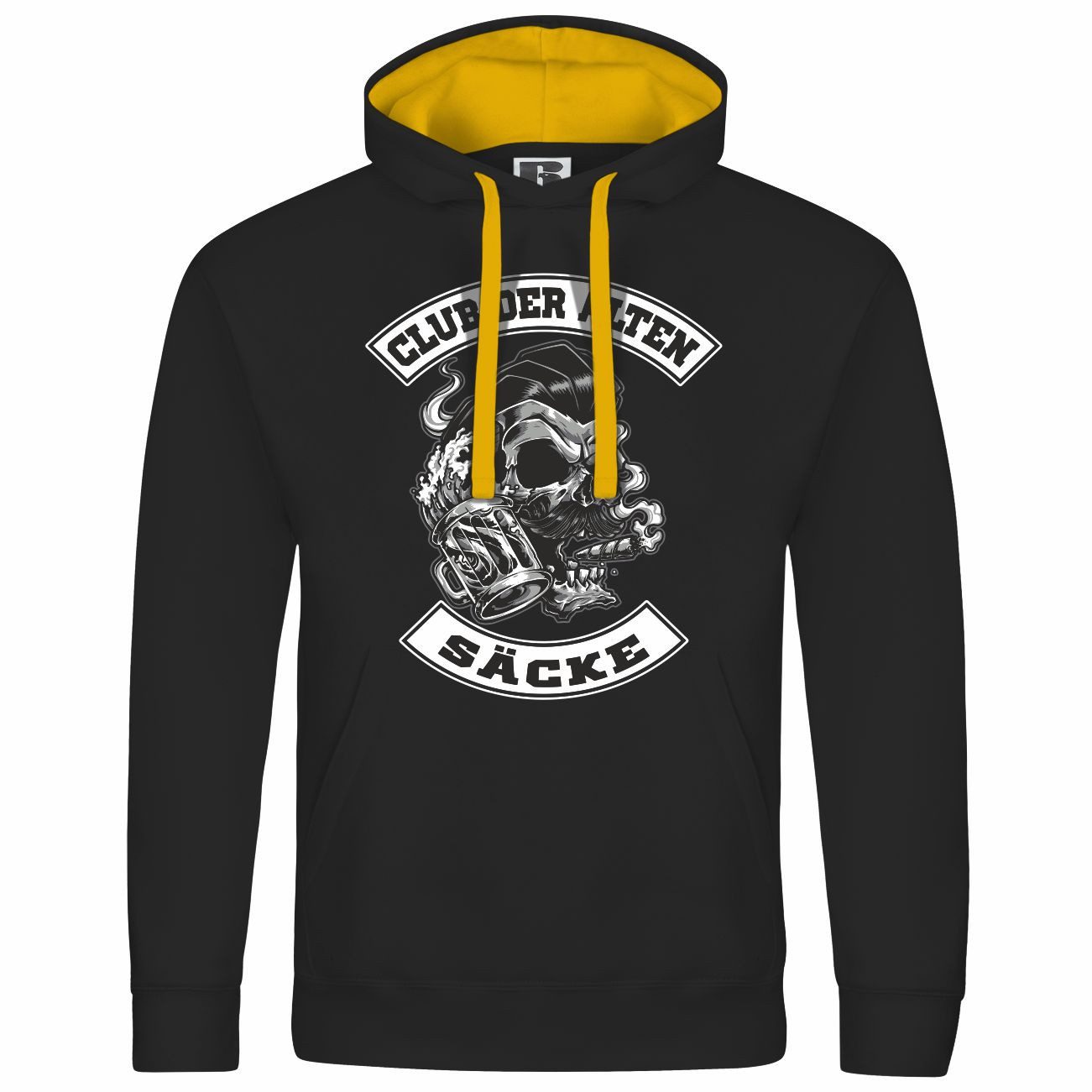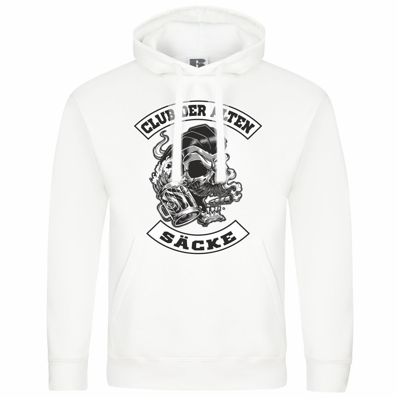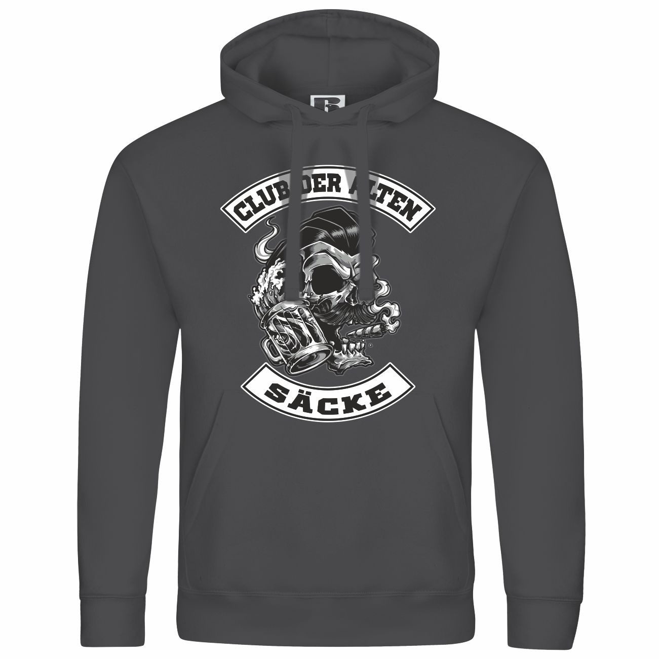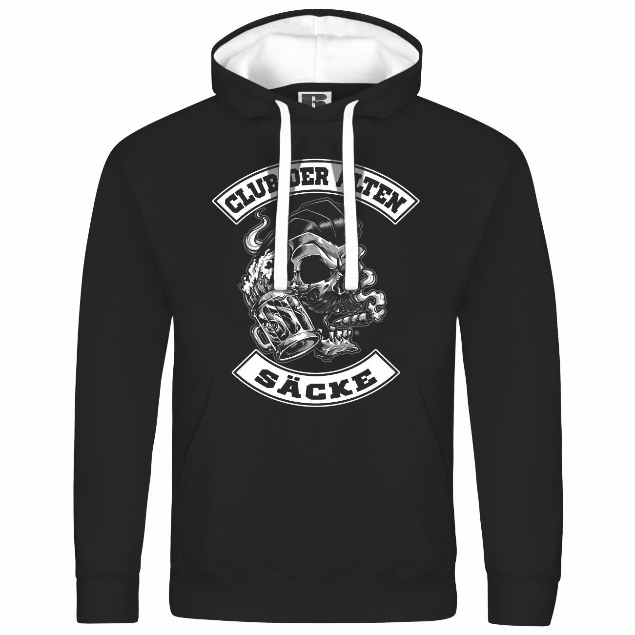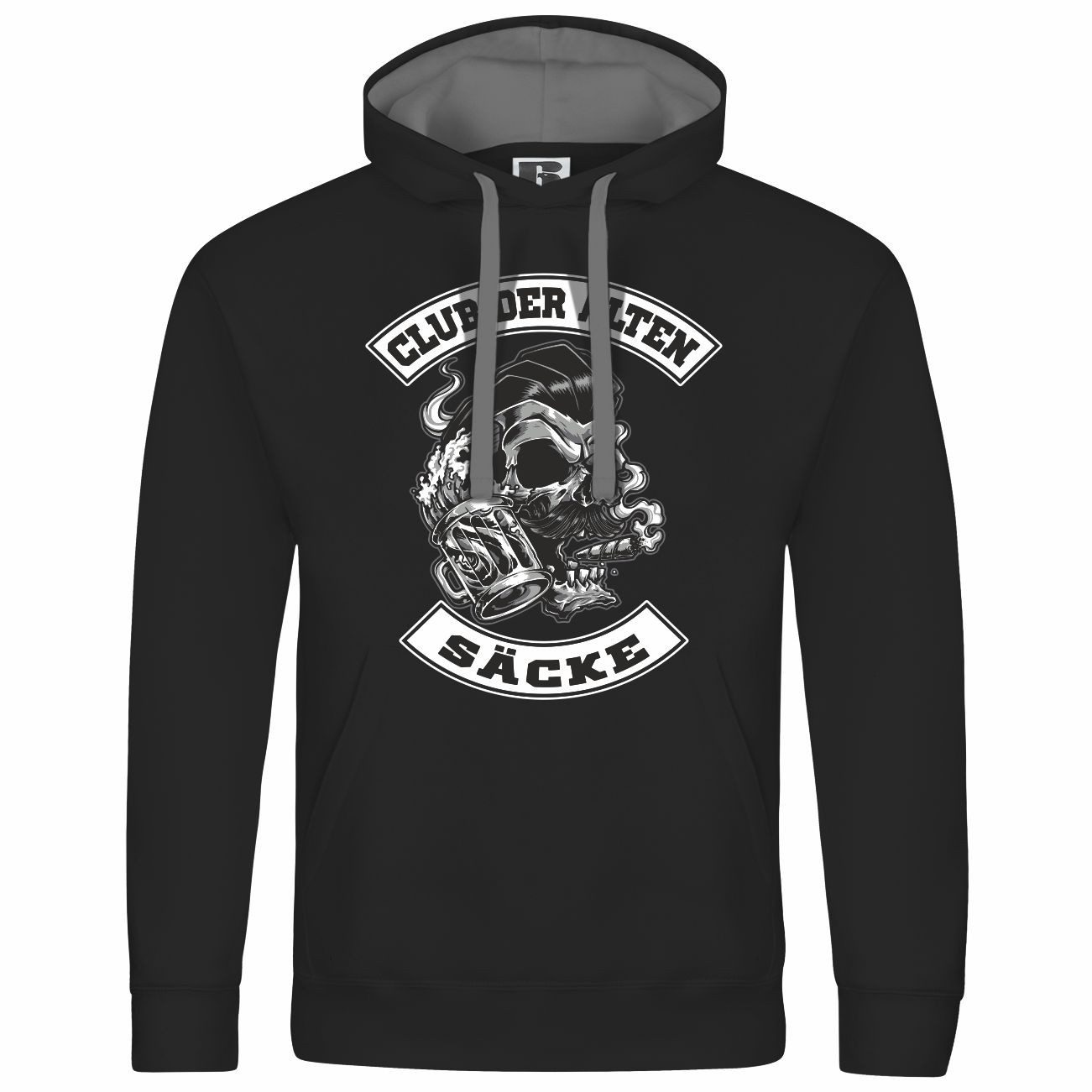 Das Motiv auf dem Kapuzenpullover zeigt einen Totenkopf mit Zigarre und Bierkrug, umrahmt von dem Schriftzug „Club der alten Säcke“. Perfekt für alle, die ein humorvolles Statement setzen möchten!