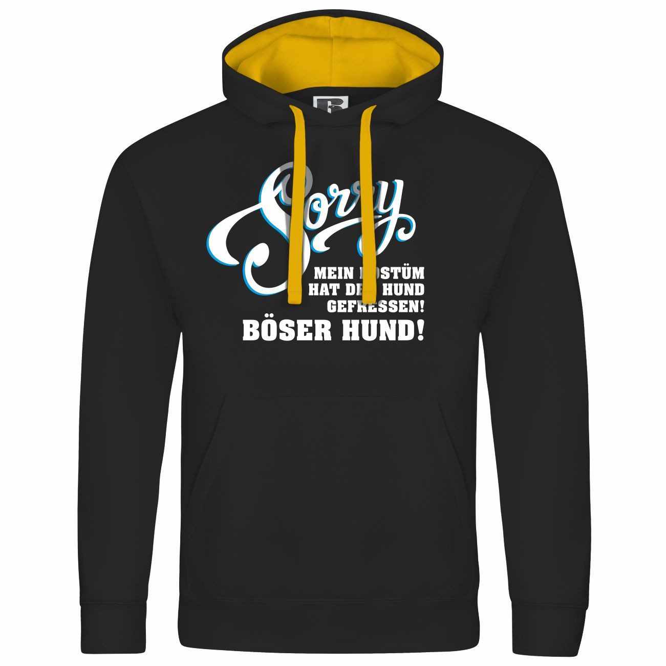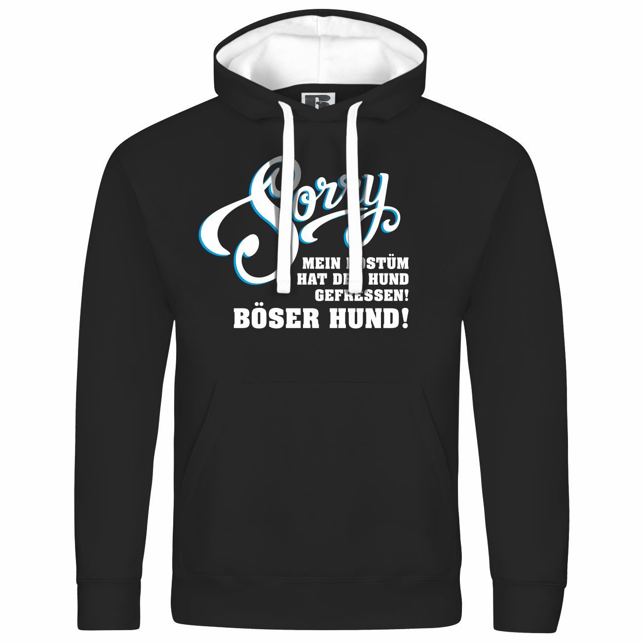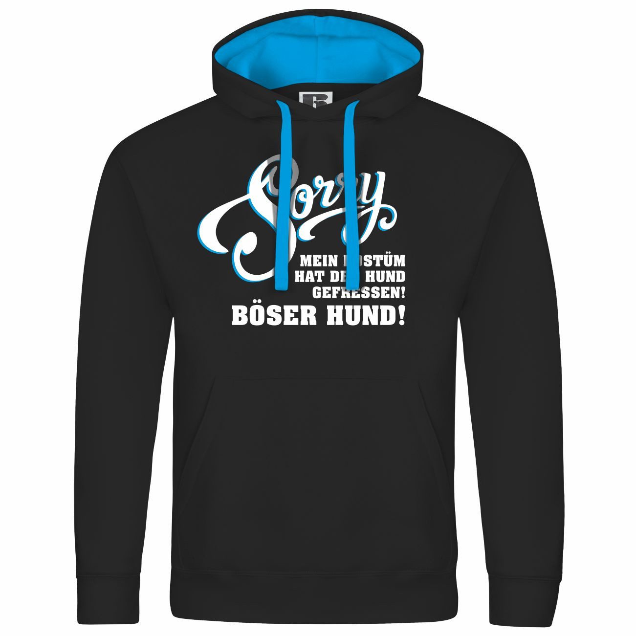Der Kapuzenpullover zeigt den witzigen Spruch „Sorry, mein Kostüm hat der Hund gefressen! Böser Hund!“. Perfekt für humorvolle Karneval- und Faschingsoutfits mit tierischem Twist!