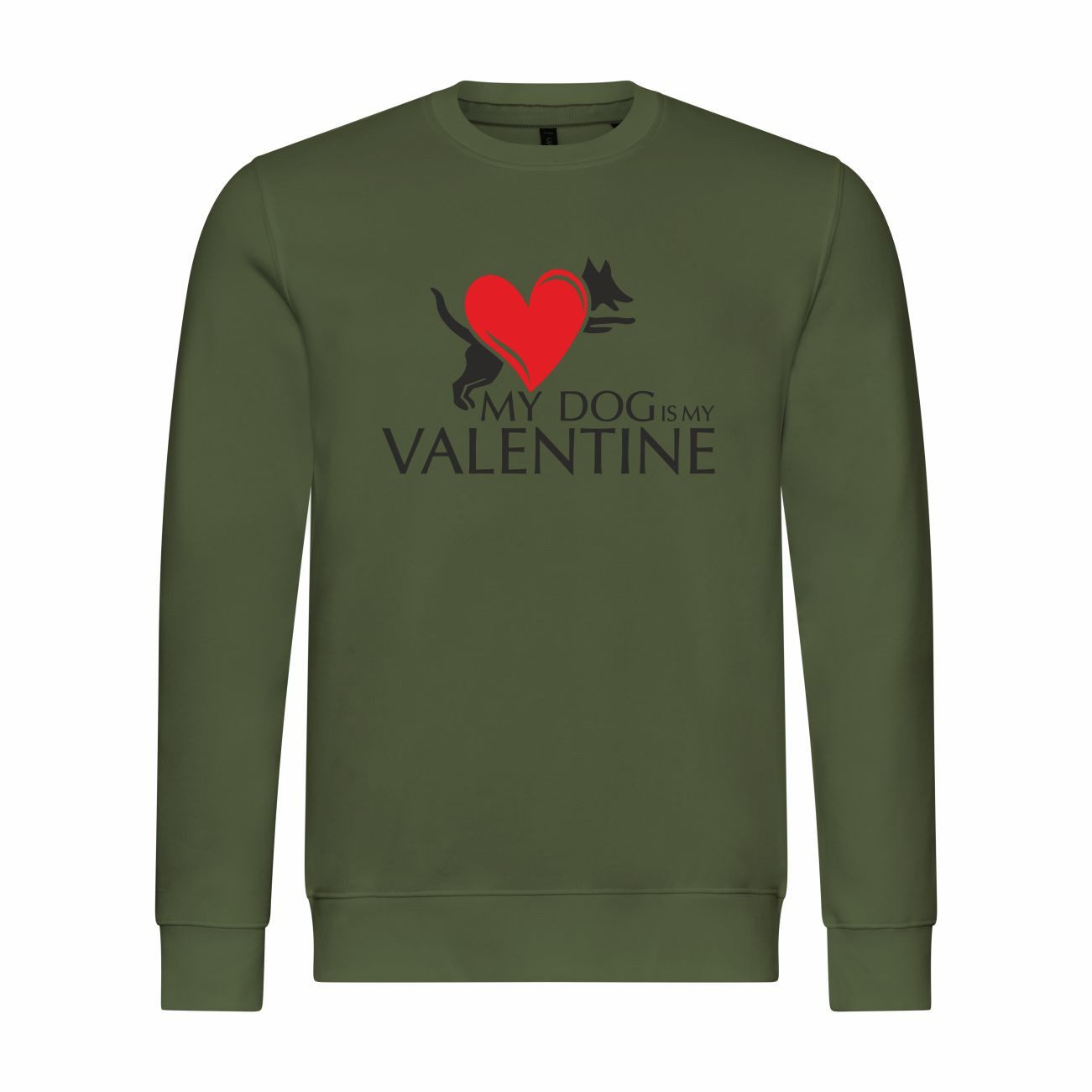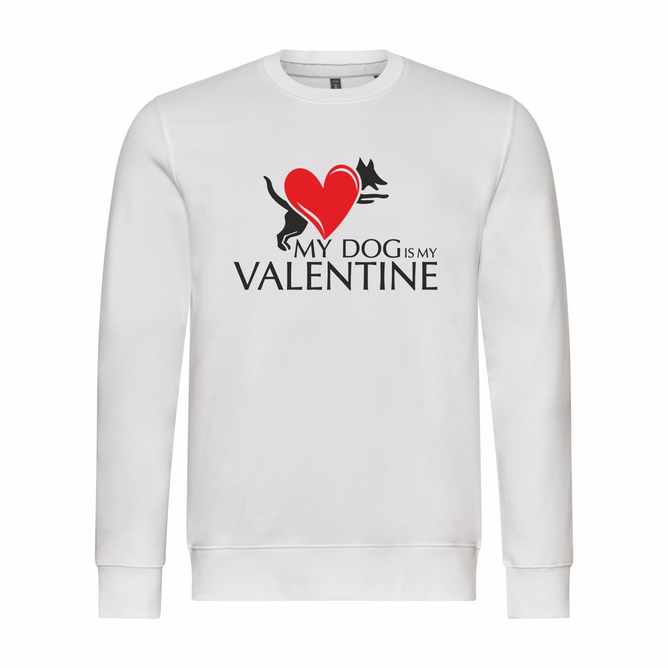 Das Sweatshirt zeigt ein Herzmotiv kombiniert mit einem Hund und dem Schriftzug „My Dog is My Valentine“. Perfekt für Hundefreunde, die ihre Liebe zu ihrem Vierbeiner auf humorvolle Weise zeigen möchten.