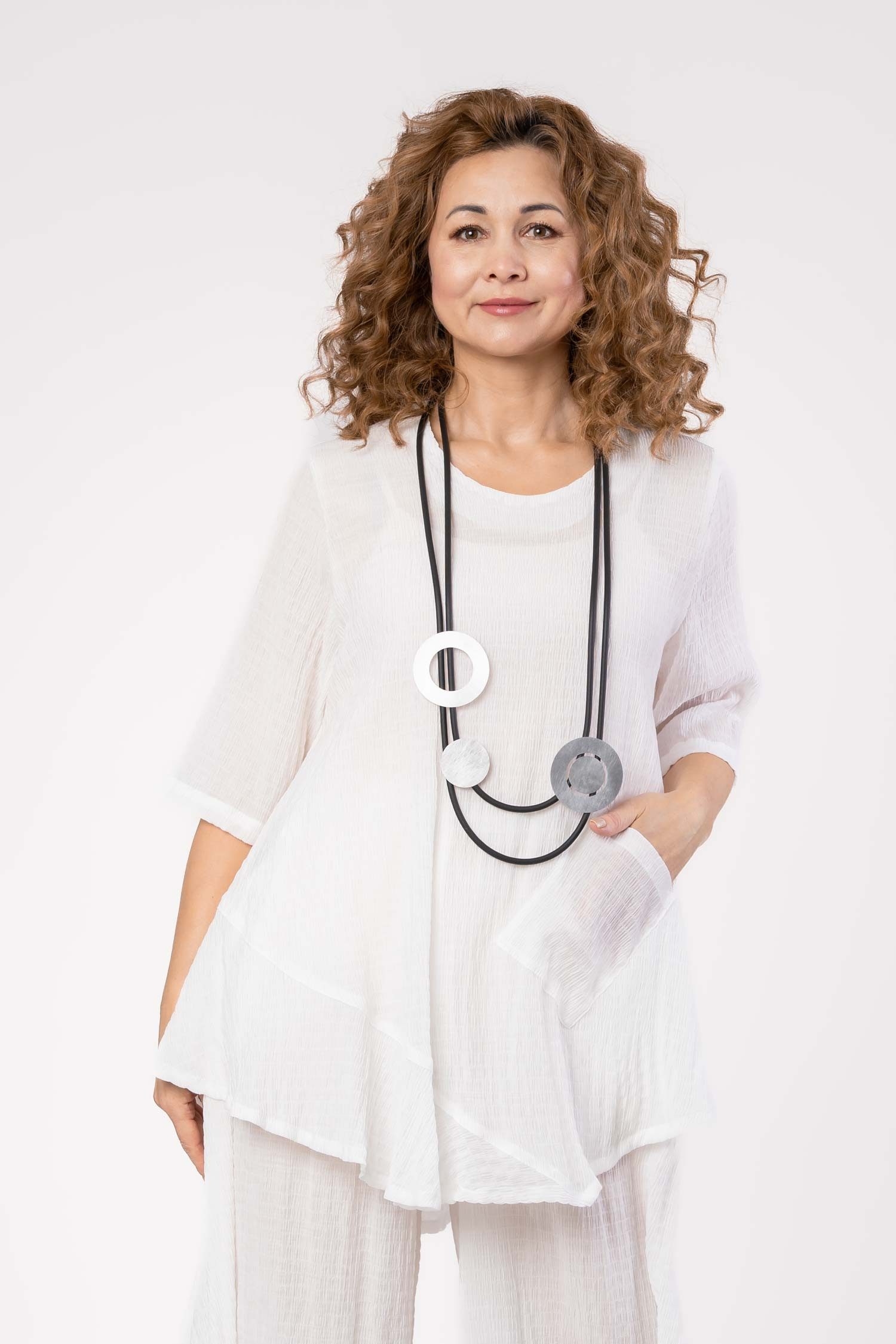 Unser Spree Oberteil in Weiß ist der ideale Begleiter für warme Tage. Der figurfreundliche A-Linien-Schnitt umspielt sanft die Silhouette und sorgt für eine schmeichelhafte Passform bei jeder Figur. Dank des lockeren Falls und der weich fließenden Stoffqualität erleben Sie höchsten Tragekomfort – den ganzen Tag über. Ein besonderes Highlight ist die dezente Ziertasche auf der Vorderseite, die dem Look eine moderne Note verleiht. Das atmungsaktive, kühlende Material macht das Oberteil zur perfekten Wahl für den Sommer und schafft ein angenehm frisches Tragegefühl. Ob lässig mit weiter Hose oder stilvoll mit einem Rock – dieses vielseitig kombinierbare Damenoberteil lässt sich mühelos in jede Garderobe integrieren. Entdecken Sie mit dem Spree Oberteil ein stylisches Must-have, das Komfort, Eleganz und Alltagstauglichkeit vereint.Größenangaben: Ärmellänge ab Halsausschnitt: 49 cm, Ärmelumfang: 44 cm, Brustumfang: 122 cm, Длина hinten: 84 cm, Длина vorne: 84 cm