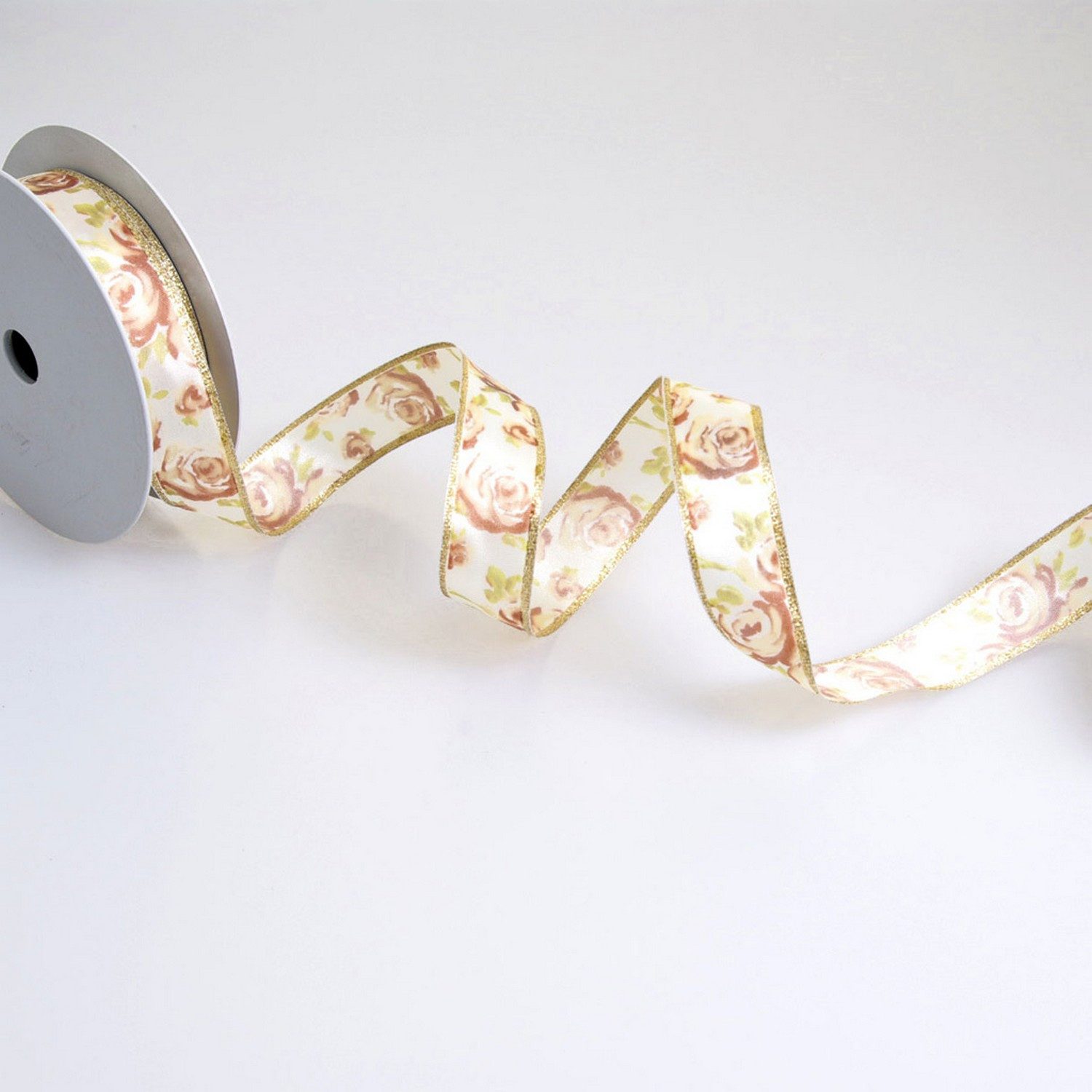 Dekoband mit einem Muster aus zarten Rosen und edler Drahtkante in Gold, ideal für romantische Dekorationen auf dem Tisch oder im Adventskranz. Auch perfekt zum Schleifen binden als Verzierung an Geschenken für die Liebsten. Das Dekoband sticht mit seinem natürlichen Muster besonders ins Auge und lässt sich besonders gut mit goldenen Dekoartikeln kombinieren.