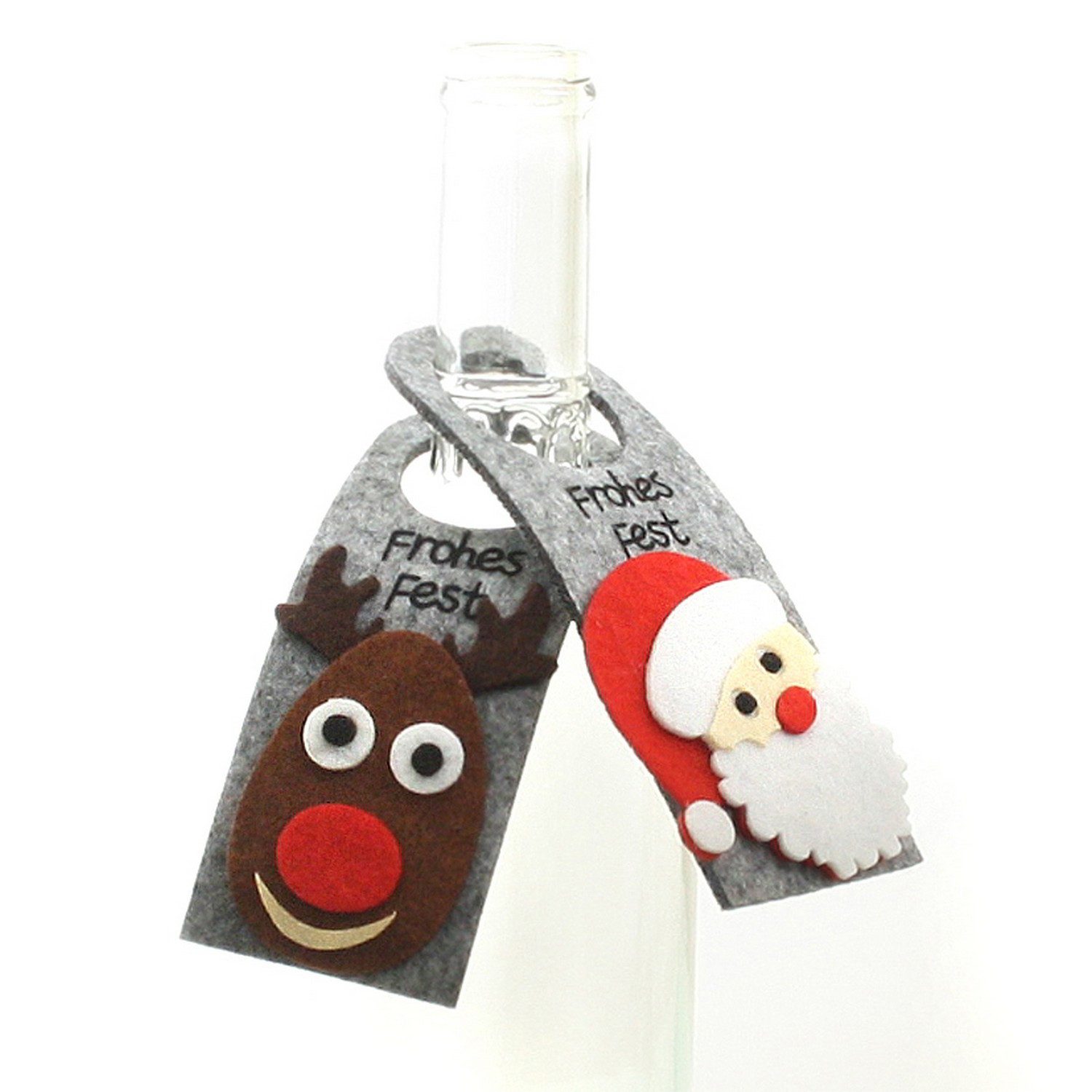 Unsere Weihnachtsanhänger mit Weihnachtsmann und Rentier aus Filz tragen die Aufschrift Frohes Fest. Sie eignen sich ideal als Flaschenhals Dekoration für Ihre Festtafel oder als winterliche Dekoration an Türklinken, passend zur Weihnachtszeit. Ebenso eignen sich die Weihnachtsanhänger zum Verschönern von Präsenten für Ihre Liebsten, sie werden die Blicke auf sich ziehen und für eine weihnachtliche Atmosphäre sorgen. Die Motive Weihnachtsmann und Elch sind niedlich anzusehen und gehen mit Farben wie Dunkelgrün und Gold eine tolle Verbindung ein.