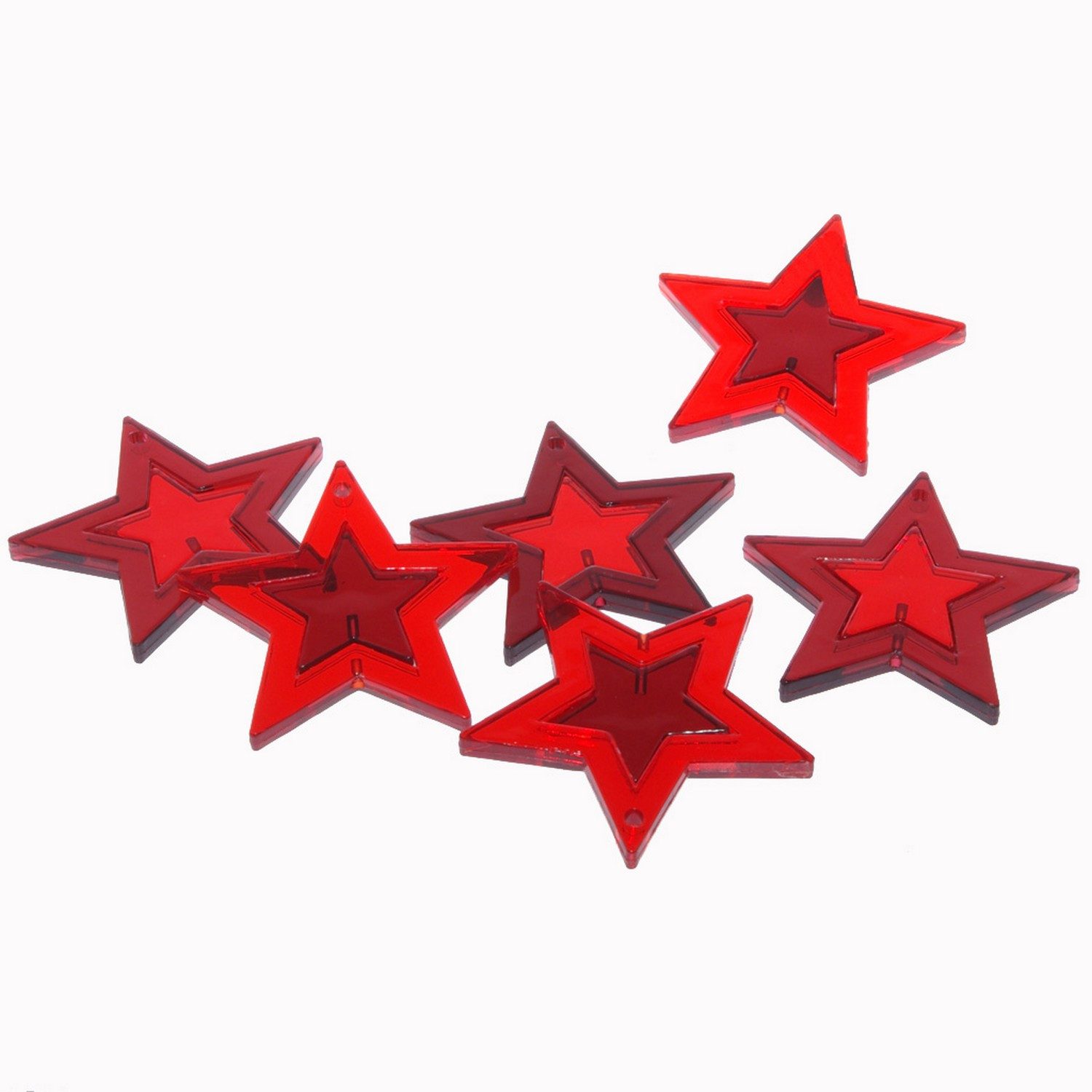 Die Sterne aus Acryl sind je 2-fach, d.h. im großen roten Stern, der ein Fädelloch besitzt, befindet sich ein kleiner bordeauxfarbener Stern, den man auch separat als Streudeko für den gedeckten Tisch auslegen kann.