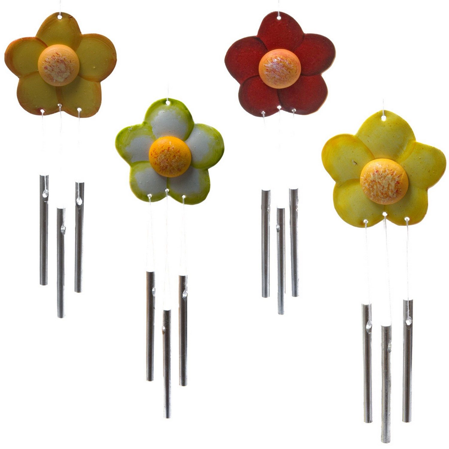 Eine verspielte Gartendeko für den Frühling sind die Metallblumen zum Aufhängen in vier verschiedenen Farben. Hängen Sie die frühlingshaften Windspiele auf den Balkon, die Terrasse oder im Haus vor ein Fenster und genießen Sie die zarten Klänge des Windes, der sanft durch die drei Metallstäbe streicht.