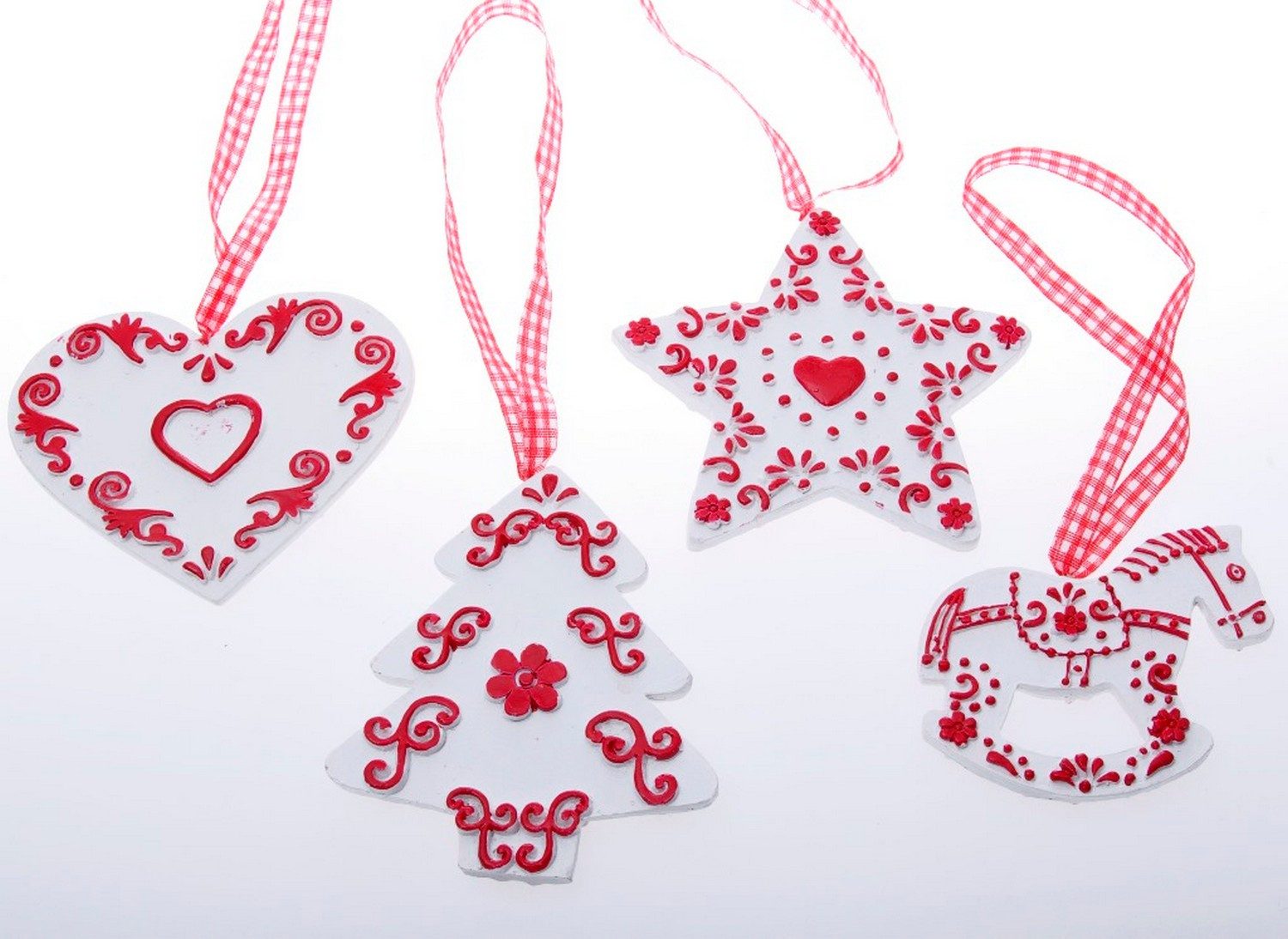 Die weißen Dekohänger aus Polyresin sehen am Tannenbaum besonders hübsch aus. Die vier verschiedenen Formen - Herz-Schaukelpferd-Tanne und Stern sind mit roten Schnörkeln verziert und bereits mit einem farblich passenden Karoband versehen. So können Sie Ihren Tannenbaum oder Türkranz sofort schmücken. Die Hänger gibt es n dieser Размер außerdem noch in Weiß-Braun.