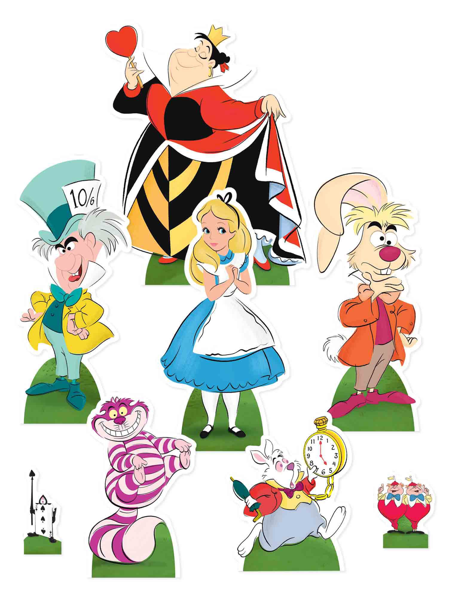 Kleine Tischaufsteller, Partydeko - Alice, Märzhase, Hutmacher je 28 cm, Grinsekatze 19 cm, Königin 27 cm, weißer Hase 17 cm, Tweedledee und Tweedledum 8 cm, Wache/Karte 9 cm. empireposter® Artikel sind lizenziert mit Echtheitssiegel. The product is officially licensed.
