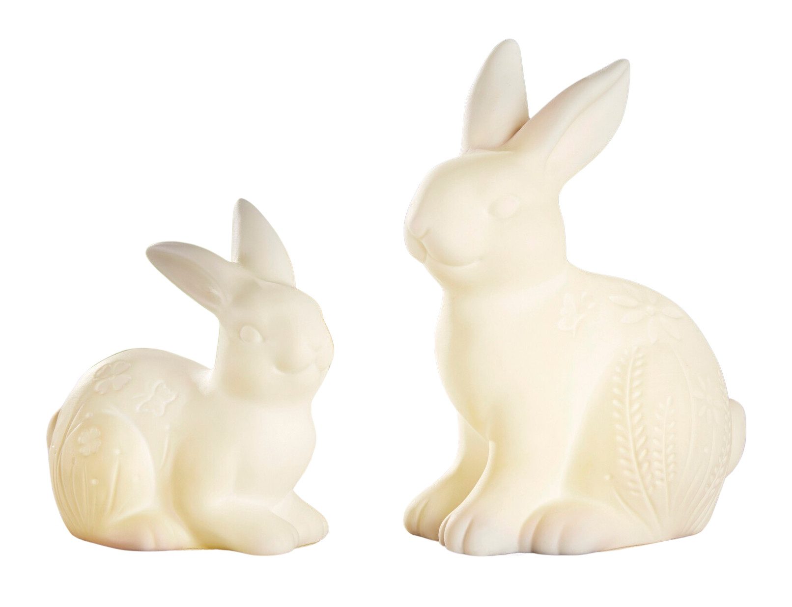 Gefertigt aus hochwertigem, mattweiß lackiertem Porzellan, strahlen die Hasen eine zeitlose Eleganz aus. Ihr sanftes Äußeres wird durch ein dezent eingeprägtes Blumen- und Wiesenmuster verziert, das ihnen eine natürliche und lebendige Note verleiht.