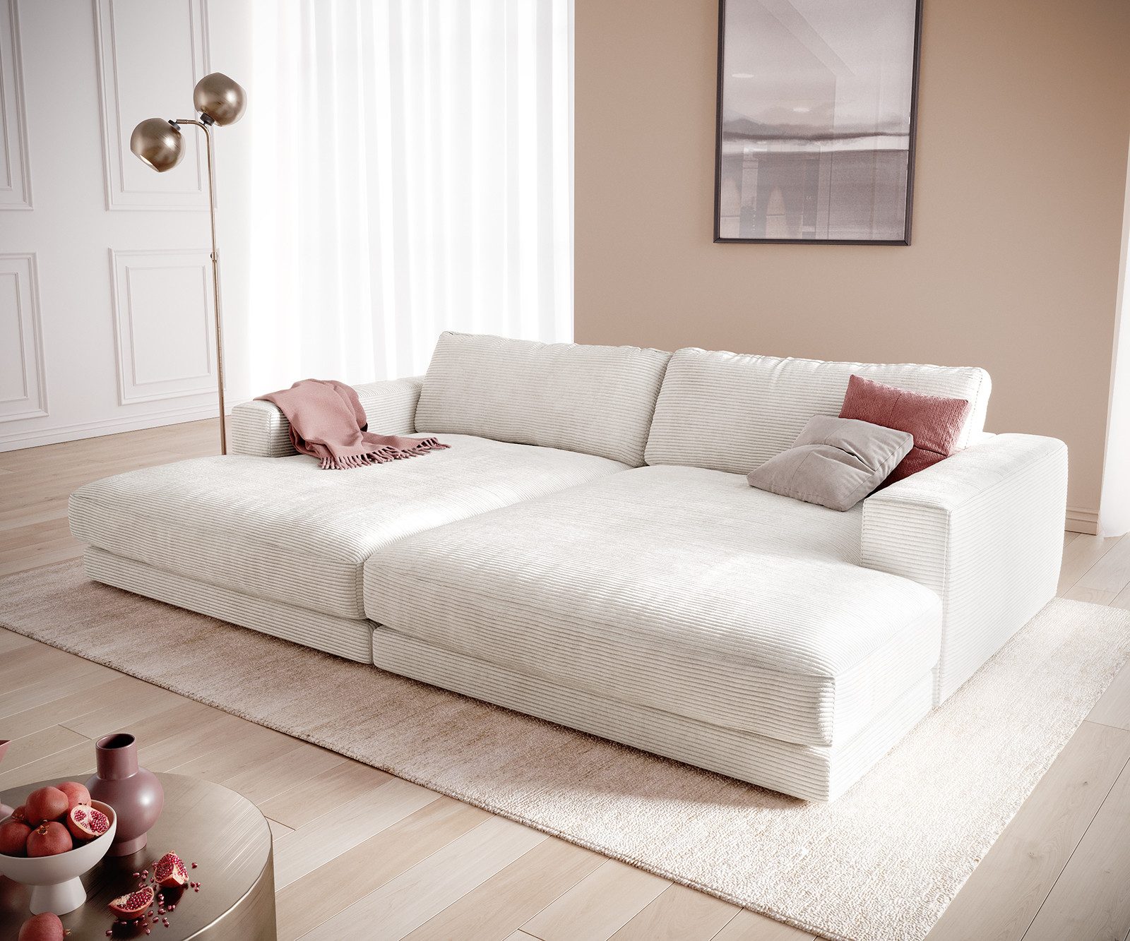 Mit einer weichen Wellenfederung schafft dieses großzügige Sofa eine Oase der Ruhe, die sich komfortabel mit den Liebsten teilen lässt. Das Design zeigt sich bodennah und schlicht. Der samtweiche Cordstoff mit seiner charakteristisch gerippten Oberfläche erscheint in hellem, beruhigendem Beige. Die besonders komfortable Polsterung zeichnet sich durch eine sehr softe Oberfläche aus, welche sich an die Körperform bestens anschmiegt und Sie wie auf Wolken sitzen lässt.