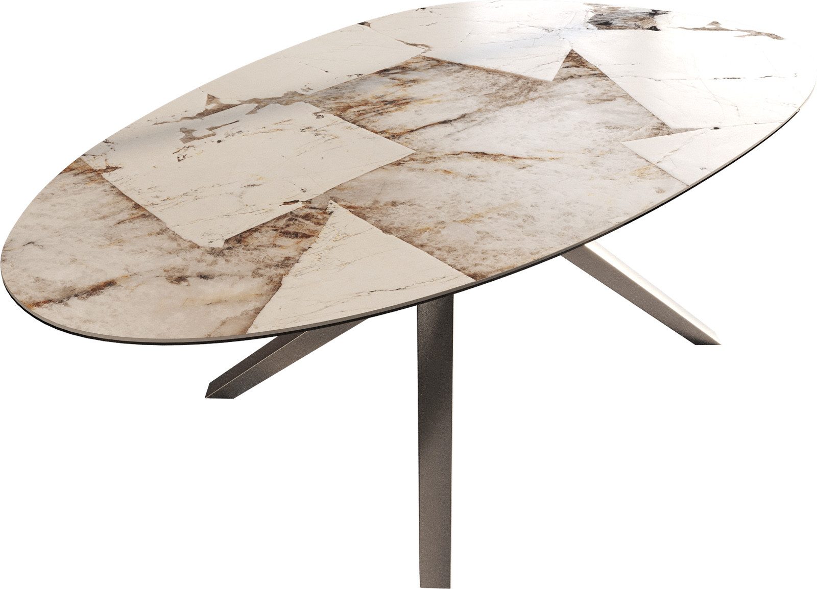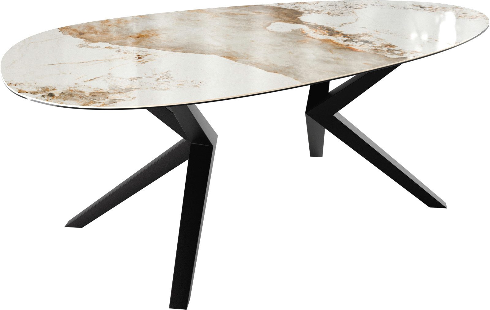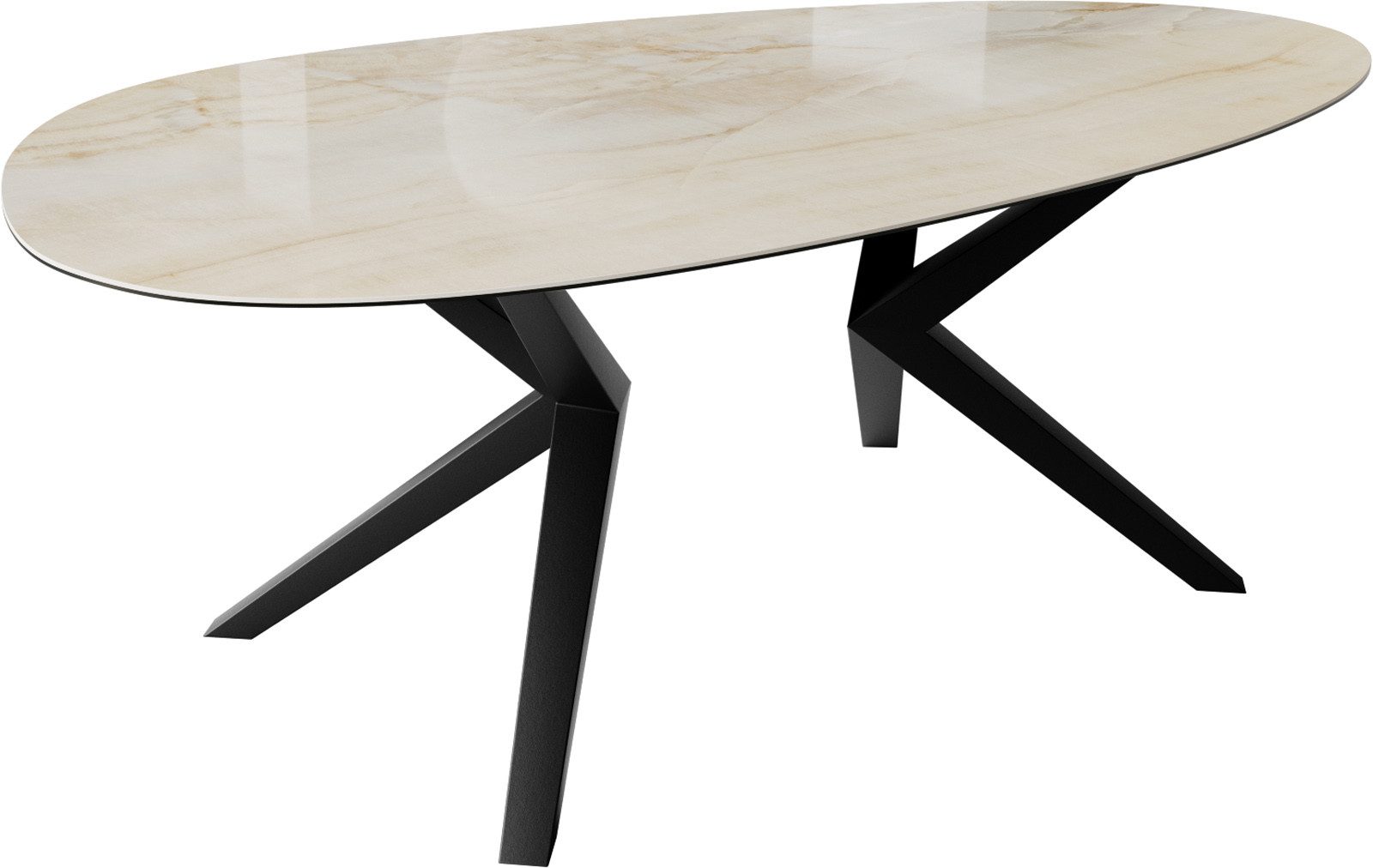 Wunderbar elegant präsentiert sich der Esstisch aus hochwertiger Keramik. Seine ovale Form betont die wunderschöne Farbgebung in Weiß- und Beigetönen. Das fließende Farbenspiel und die besonders glatte Oberfläche erinnern an fein polierten Marmor. Im Gegensatz zu echtem Marmor lässt sich die Keramikplatte aber jederzeit einfach reinigen und ist robust gegen Kratzer und Flecken.