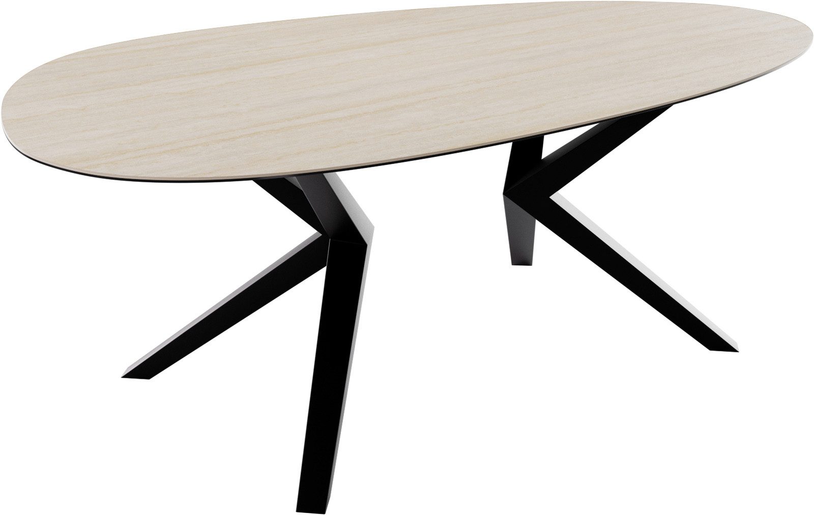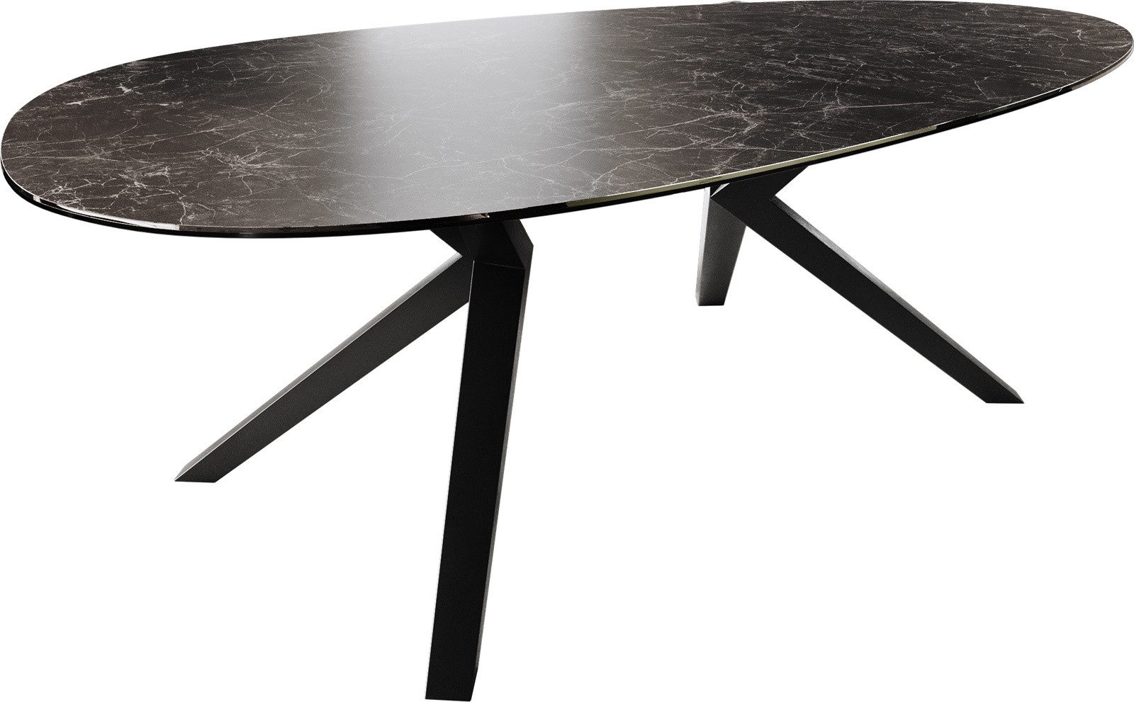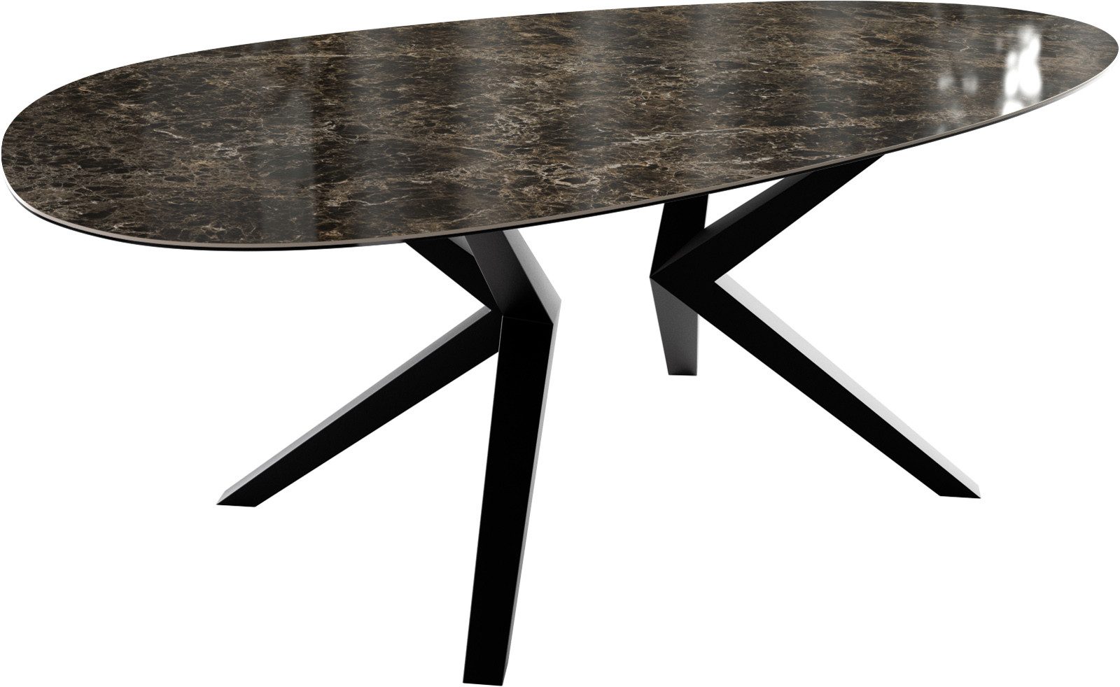 Wunderbar elegant präsentiert sich der Esstisch aus hochwertiger Keramik. Seine ovale Form betont die wunderschöne Farbgebung in Weiß- und Beigetönen. Das fließende Farbenspiel und die besonders glatte Oberfläche erinnern an fein polierten Marmor. Im Gegensatz zu echtem Marmor lässt sich die Keramikplatte aber jederzeit einfach reinigen und ist robust gegen Kratzer und Flecken.
