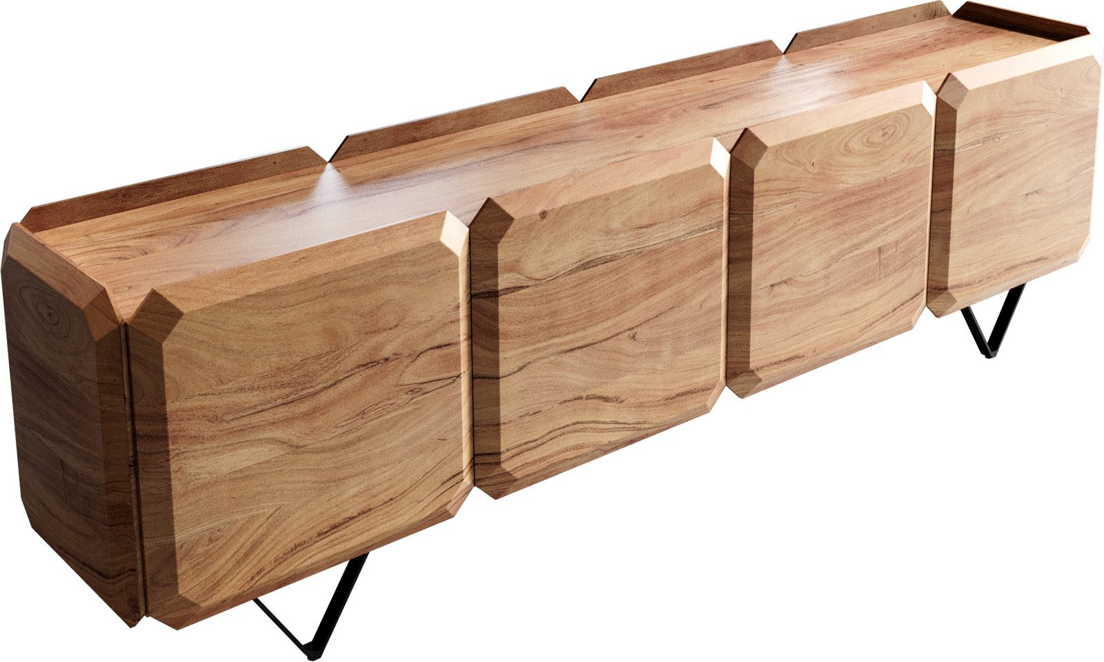 Das vielseitige Lowboard Kiano besticht durch seine einzigartige Würfel-Optik, bei der die Türen wie perfekt aneinandergereihte Kuben erscheinen. Es wurde speziell dafür entworfen, frei im Raum platziert zu werden, um eine wohnliche und gleichzeitig funktionale Lösung zu bieten. Das warme Akazienholz sorgt für eine angenehme, natürliche Atmosphäre, während das innovative Design mit den grifflosen, präzise gearbeiteten Türen jeden Raum aufwertet. Egal, ob du es als TV-Möbel oder Raumteiler nutzt – Kiano kombiniert Stil und Funktion in perfekter Harmonie. Die einzigartigen V-Füße aus pulverbeschichtetem Metall geben sicheren Stand und sorgen für einen leichten Look mit angenehmer Bodenfreiheit. Durch das aufwendige Verfahren der Pulverbeschichtung entsteht eine sehr regelmäßige Oberfläche, die besonders robust und widerstandsfähig gegen Kratzer und Beschädigungen ist. Dadurch lässt sich das Gestell einfach reinigen und bleibt lange schön.