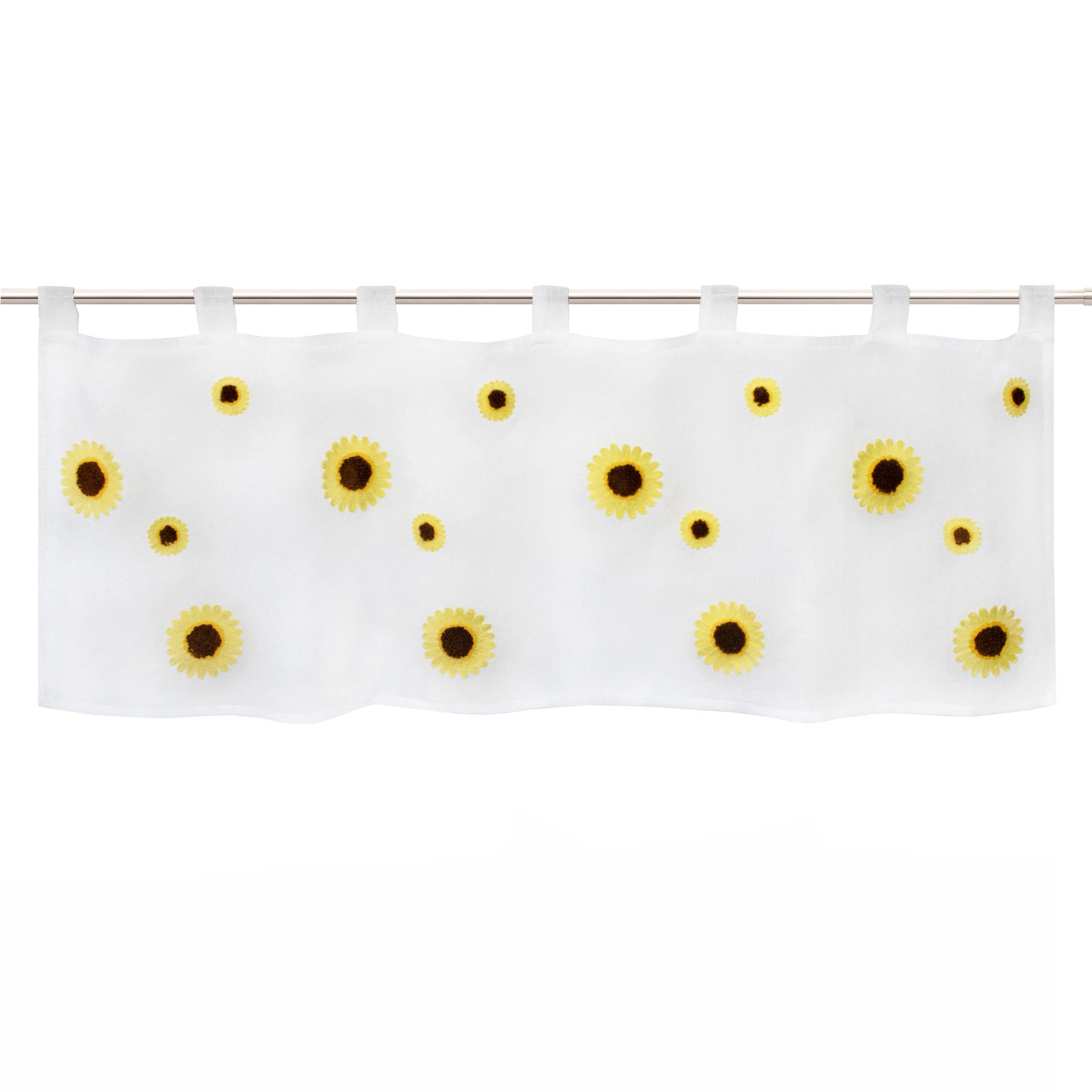 Unsere wunderschöne Scheibengardine mit einem bestickten Sonnenblumen Motiv ist die ideale Ergänzung für jedes Kinderzimmer. Das Motiv, bestehend aus sommerlichen Blumen, verleiht dem Raum eine liebevolle und verspielte Atmosphäre. Die Bistrogardine ist in einem klassischen Weiß gehalten, was sie zu einer zeitlosen Wahl für Jungen und Mädchen macht. Die Farbe Weiß passt zu nahezu jeder Einrichtung und lässt sich leicht mit anderen Farben und Mustern kombinieren. Die transparente Beschaffenheit der Gardine sorgt dafür, dass ausreichend Tageslicht in den Raum gelangt, während gleichzeitig Ihre Privatsphäre geschützt bleibt. Sie misst 45x115 cm und ist somit ideal für kleinere Fenster geeignet. Die Scheibengardine besitzt Schlaufen und ermöglicht daher eine einfache und schnelle Montage an Ihrer Fensterstange. Unsere Scheibengardine ist auch OEKOTEX 100 zertifiziert, was bedeutet, dass sie frei von schädlichen Chemikalien ist und strengen Umwelt- und Gesundheitsstandards entspricht. Unser hochwertiges Material gewährleistet eine lange Haltbarkeit und einfache Pflege. Sie können die Gardine problemlos in der Maschine waschen und bei Bedarf bügeln, um sie in einem makellosen Zustand zu halten.