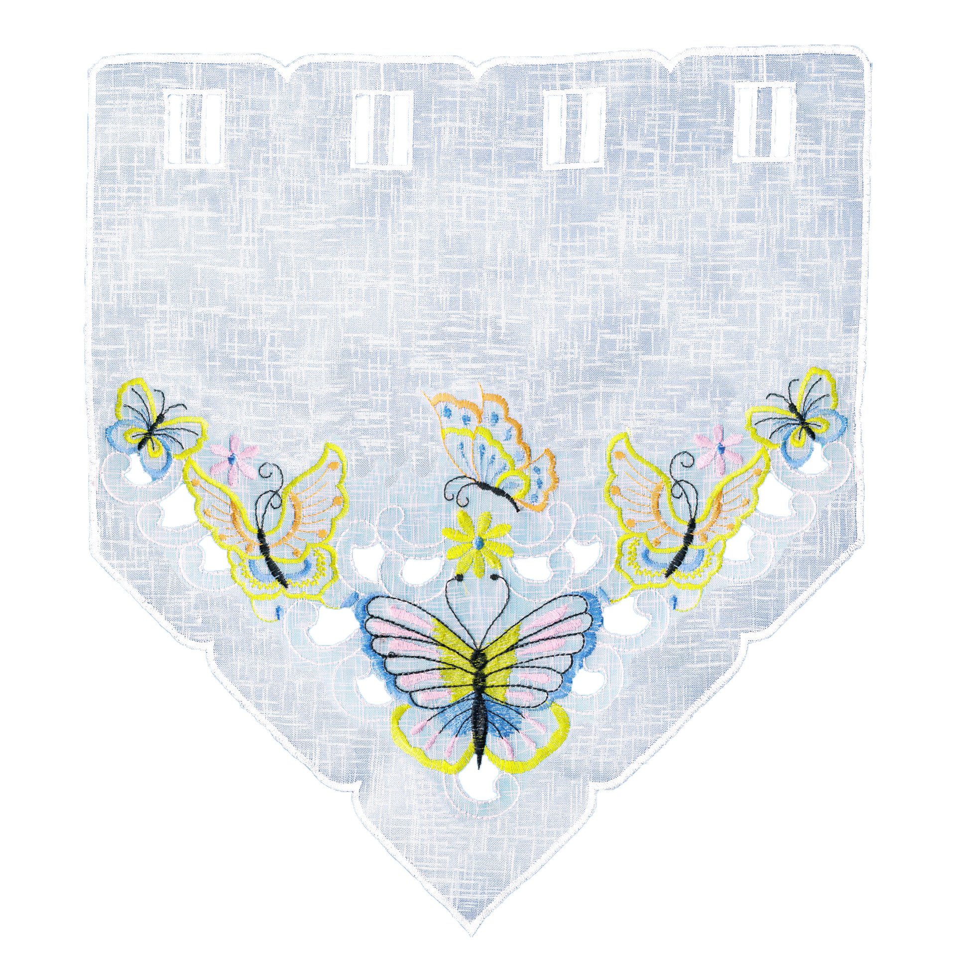 Diese besondere Scheibengardine »SCHMETTERLINGE« von Delindo Lifestyle besticht durch eine dezente Zierstickerei mit einem hübschen Motiv, welche sich perfekt in die klassische Küche integrieren lässt. Die Bistrogardine besteht aus 2 Teilen, welche sich entweder nebeneinander oder auch einzeln platzieren lassen. Somit können Sie selbst entscheiden, wie eng oder weiter auseinander gezogen Sie dekorieren möchten. Ein Teil ist 35 cm breit und 40 cm hoch. Die bezaubernde Gardine passt nicht nur Ihre Küche, sondern auch in alle Räume, in denen eine winterliche Atmosphäre gefragt ist. Eine leicht transparente Qualität lässt sehr viel Licht hindurch, bietet aber auch einen guten Sichtschutz gegen neugierige Blicke von außen. Diese Bistrogardine glänzt mit pflegeleichten Merkmalen, sodass sie in der Waschmaschine waschbar ist. Die Kurzgardine punktet mit einem Stangendurchzug für Stäbe bis zu 20 mm Durchmesser. Diese Gardine sorgt für ein gemütliches Ambiente in Ihrem Zuhause. Lassen Sie sich bezaubern durch diesen einzigartigen Blickfang für Ihr Fenster. Sie erhalten ein hervorragendes Qualitätsprodukt aus dem Hause DELINDO LIFESTYLE.