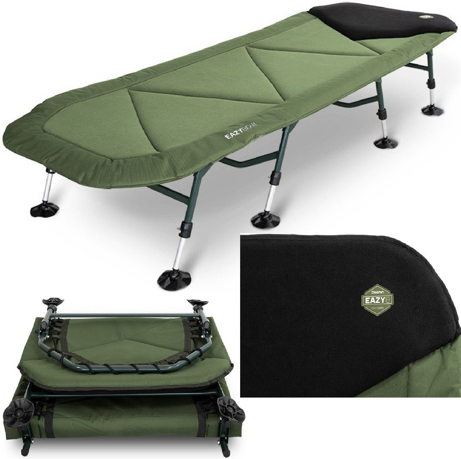 Eine komfortable Liege mit 8 Beinen, die ein hervorragendes Verhältnis zwischen dem Komfort, der Funktionalität und dem günstigen Anschaffungspreis bietet. Die Grundlage ist eine sehr robuste, langlebige und dennoch leichte grüne Konstruktion, die zusammen mit den acht Beinen der Liege die notwendige Stabilität verleiht. Die höhenverstellbaren Beine sind an den Enden mit den stabilen Füßen auf den Kugelzapfen ausgestattet, so dass sie sich auch dem unebenen Gelände anpassen können. Zusätzlich ist das Beinpaar unter dem Kopfteil mit einem Verriegelungsmechanismus ausgestattet, der das Aufklappen der Liege erleichtert und ein unerwünschtes Zusammenklappen oder Verrutschen verhindert. Die Matratze besteht aus dem Vliesstoff mit einer ausgefallenen Steppung auf der Oberseite, was sie sehr bequem, warm und originell im Design macht. Ausserdem ist sie rundherum mit einem langlebigen 600D-Gewebe in Grün ausgestattet, das zur Verlängerung der Produktlebensdauer beiträgt. Für den maximalen Komfort ist das obere Kopfteil mit einem extra gepolsterten Fleece-Pannel versehen. Der Härtegrad der Matratze kann im Bein- und Kopfbereich durch das Spannen des an den Unterkanten verlaufenden Fixseils eingestellt werden. Wenn Sie auf der Suche nach einer bequemen Liege zu einem vernünftigen Preis sind, sollten Sie sich unbedingt die EazyEIGHT8 ansehen. Technische Parameter: Abmessungen der Matratze: 200x75cm Höhe der Liegefläche: 30-40cm Fixierbares Gelenk: nein Gewicht: 9,5kg Transportabmessungen: 75x77x30cm