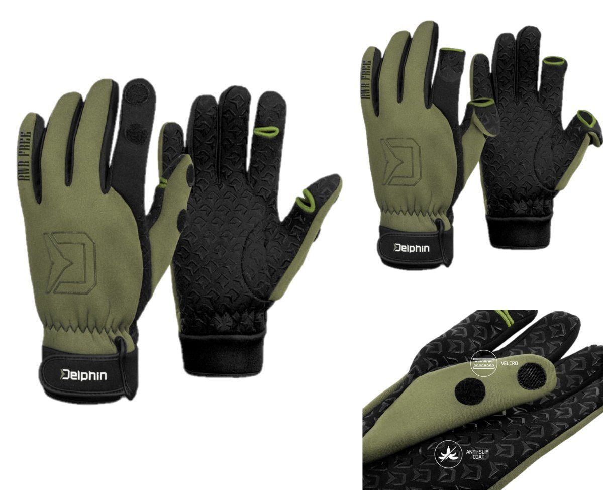 Neoprenhandschuhe Delphin RWR Free. Die Delphin RWR Free Neoprenhandschuhe halten Ihre Hände auch an den kältesten Tagen warm. Die detaillierte Verarbeitung der Handschuhe, hebt das Niveau des Winterangelns auf ein ganz anderes Niveau. Ein großes Plus ist auch die gummierte Oberfläche auf der Handfläche, die mit einer rutschfesten, gummierten Schicht mit einem innovativen Design des Delphin-Logos ausgestattet ist. Abnehmbare Teile am Ende des Daumens und des Zeigefingers, die mit einem Klettverschluss befestigt werden können, erleichtern Ihnen die Handhabung von kleinen Schmuckstücken oder beschleunigen die Einstellung der Montage. Um zu verhindern, dass Kälte oder unerwünschtes Wasser in die Handschuhe eindringt, ist die Dichtung aus eingenähtem Gummi und kann zusätzlich mit einem Klettverschlussband verstellt werden. Die Farbkombination aus Grün und Schwarz macht die RWR Free Handschuhe zum perfekten Begleiter beim Angeln, aber auch bei anderen Freizeitaktivitäten.