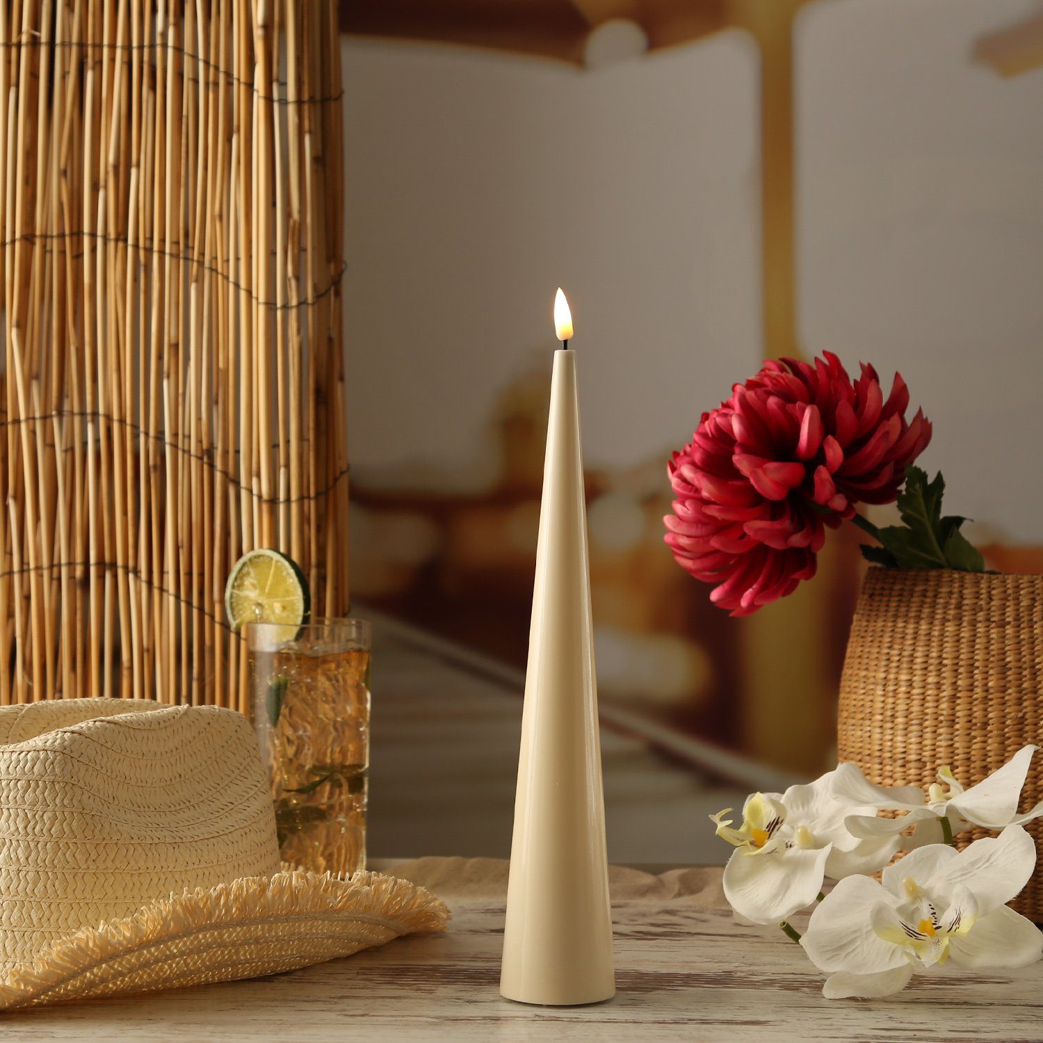 Die LED Kerze LEA ist eine zauberhafte Dekoration, die alleine schon durch ihre tolle, spitz zulaufende Kegelform auffällt.