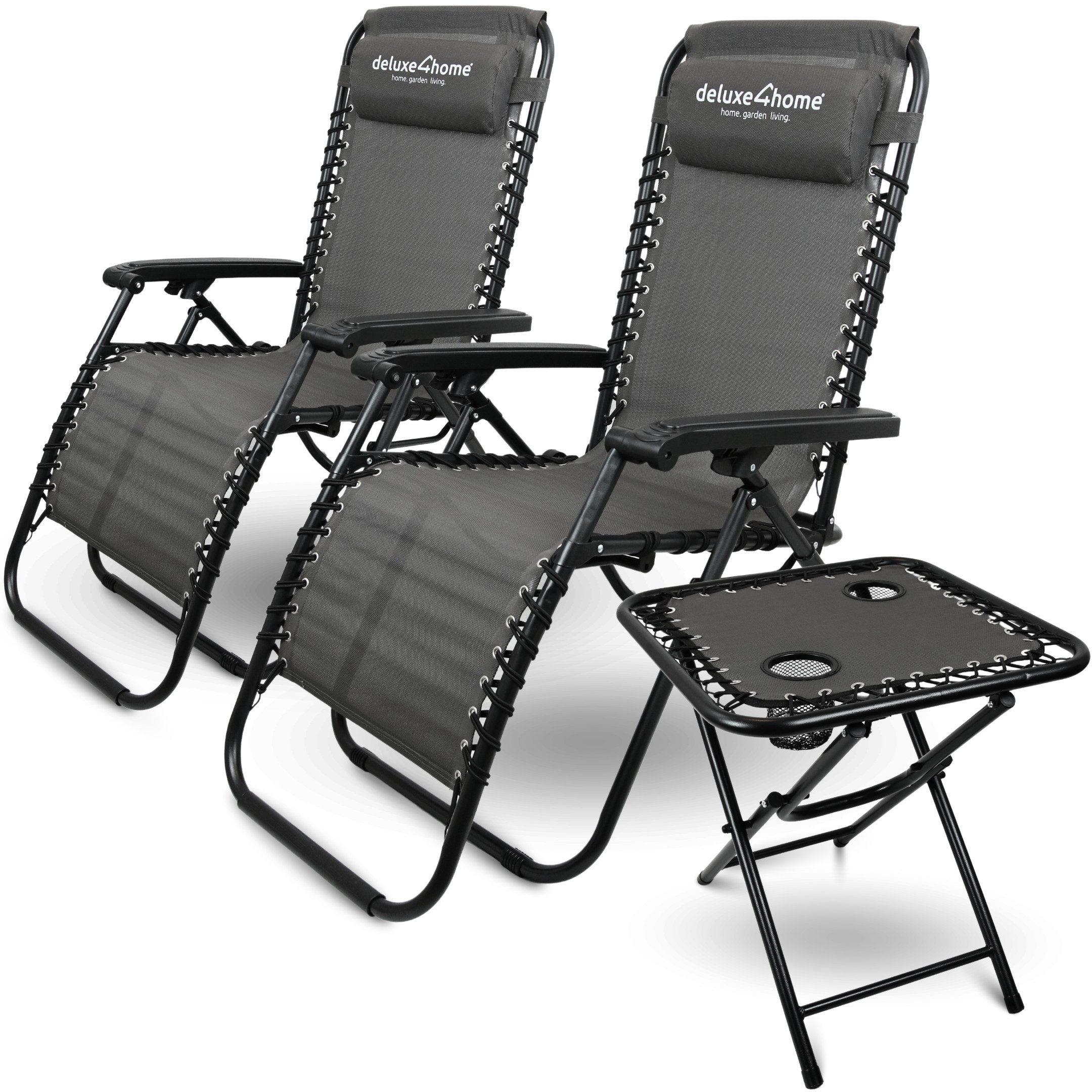 Entdecke den ultimativen Komfort im Freien mit unserem Set aus zwei klappbaren Liegestühlen und einem praktischen Klapptisch in eleganter Anthrazitfarbe. Hergestellt aus hochwertigem Kunstfasergewebe und robusten Stahlrohrgestellen bieten die Liegestühle nicht nur außergewöhnlichen Komfort, sondern auch Langlebigkeit. Die mitgelieferten Kopfkissen und Armlehnen sorgen für zusätzliche Entspannung. Der klappbare Tisch verfügt über zwei Getränkehalter und ist perfekt für Erfrischungen geeignet. Leicht zu transportieren und überall aufzustellen, ist dieses Set ideal für Sonnenbäder im Garten, Entspannung am Strand oder ruhige Leseecken im Freien. Gönn Dir Komfort und Stil im Freien mit unserem Set!