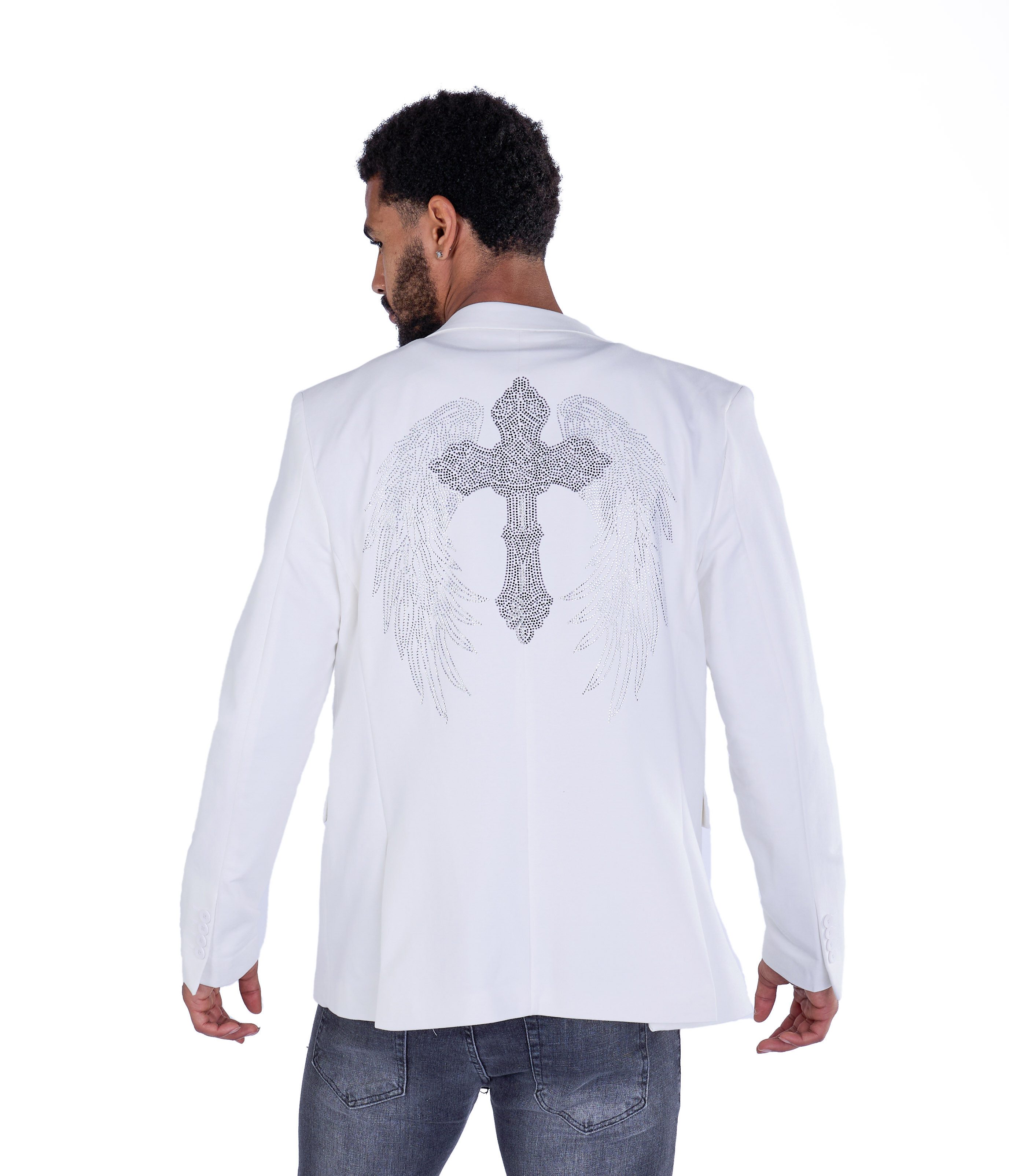 Das absolute Highlight dieses Sakkos ist das große, kunstvoll verzierte Kreuz auf der Rückenpartie, das links und rechts von eleganten, strassveredelten Flügeln flankiert wird. Dieses Detail macht das Sakko zu einem unverwechselbaren Blickfang. Ein weiteres dezentes, aber stilvolles Highlight ist das kleine Kreuz auf der linken Brust, das den exklusiven Look perfekt abrundet.