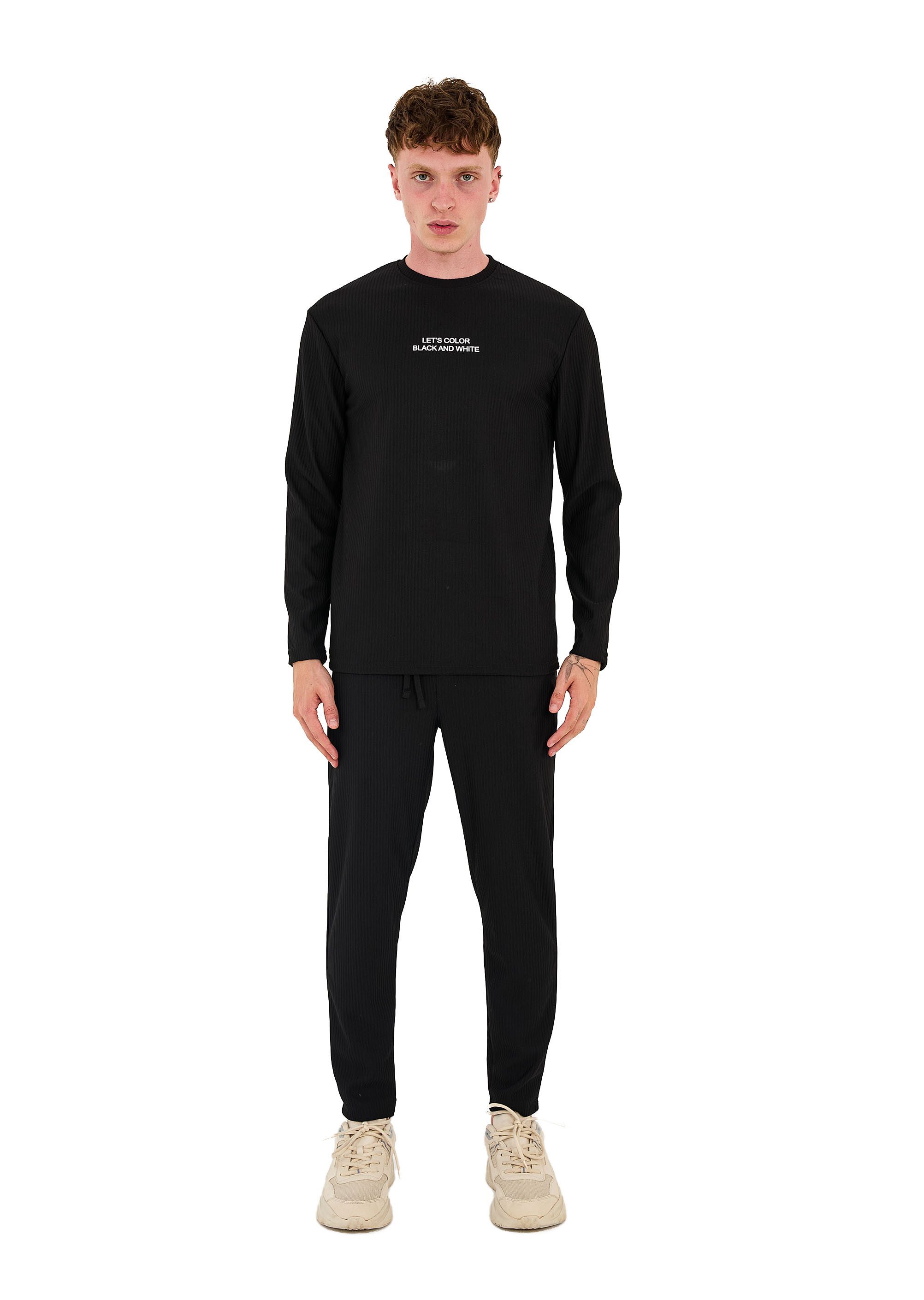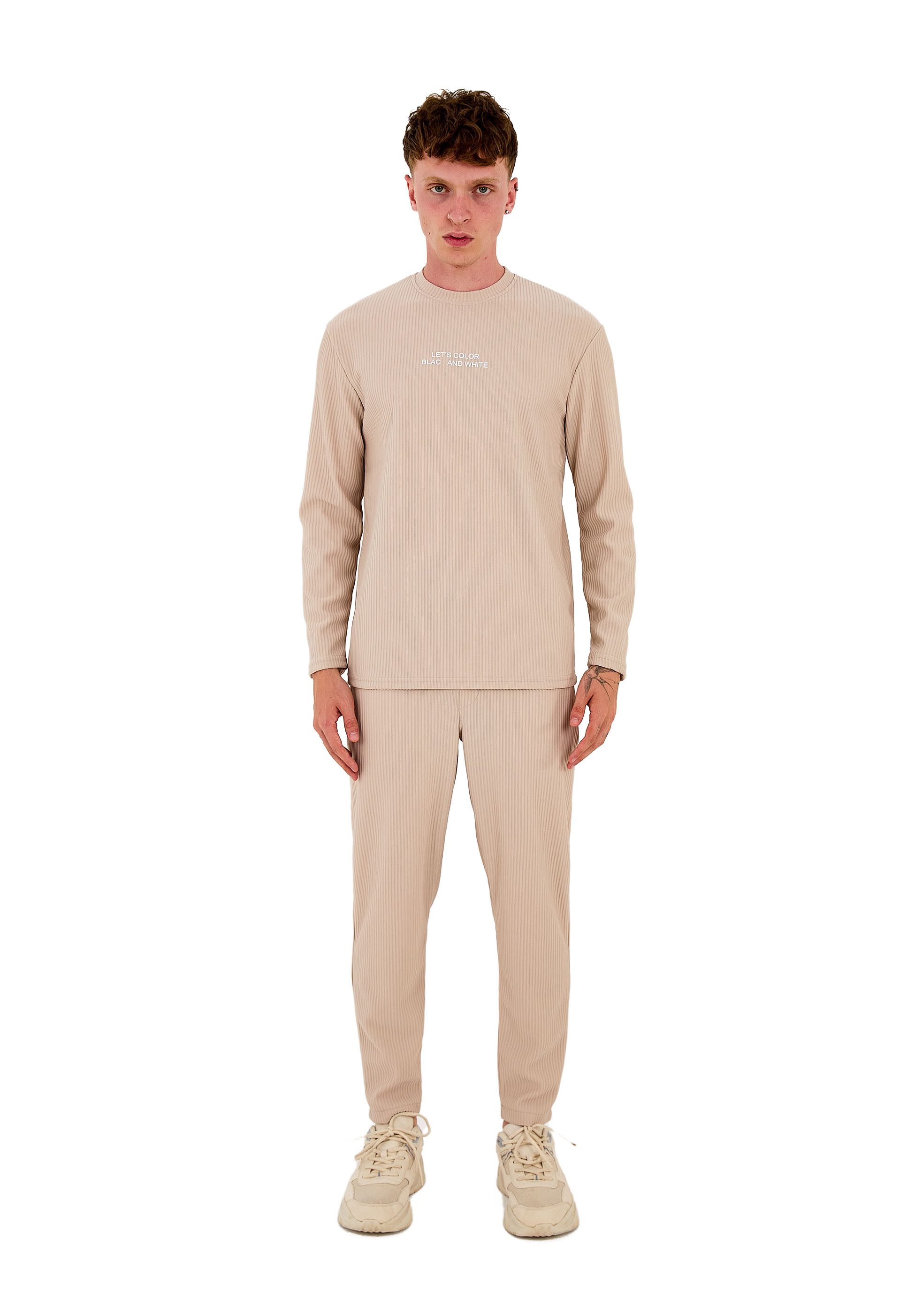 Gönn dir maximale Bequemlichkeit mit unserem neuen Herren-Jogginganzug aus hochwertigem Baumwollmix. Das Oberteil hat einen Schriftzug auf der Brust als optisches Highlight. Der umgenähten Saum an Ärmeln sorgt für eine perfekte Passform. Die dazugehörige Hose mit zwei Seitentaschen und einer Gesäßtasche bietet ausreichend Stauraum für deine Essentials. Der Slim Fit Schnitt und der weiche Baumwollstoff machen diesen Jogginganzug zum idealen Begleiter für Zuhause oder unterwegs. Erhältlich in den Farben Beige, Blau, Mint und Schwarz.