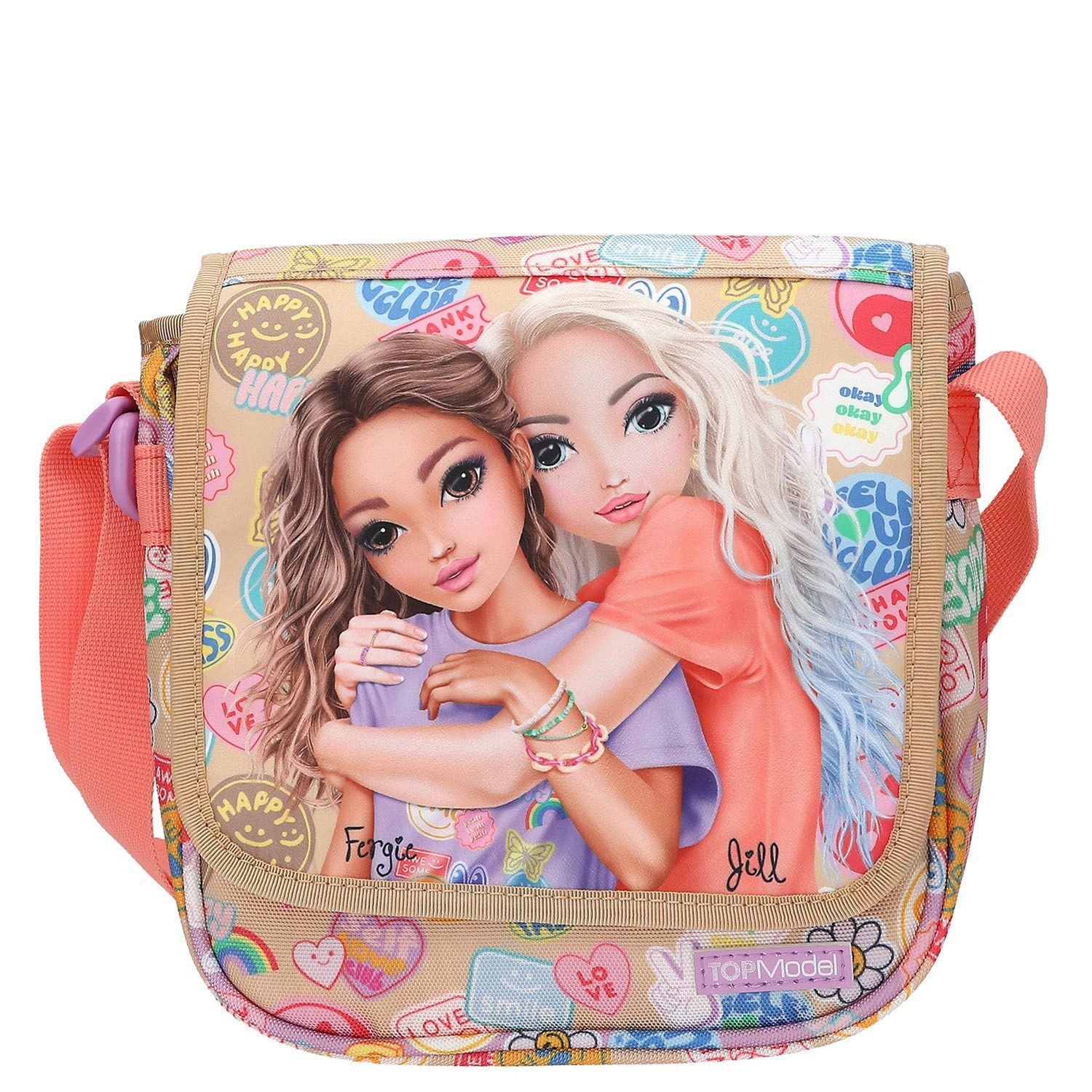 Batch-Boom! Die TOPModel-Umhängetasche in tollem Beige und Koralle hat ein stylishes Doppel-Modelmotiv und coole bunte Batch-Prints auf der Front und auf den Seiten. Der Umhängegurt ist in der Длина verstellbar. Praktisch: der Ring zum Befestigen von Anhängern.
