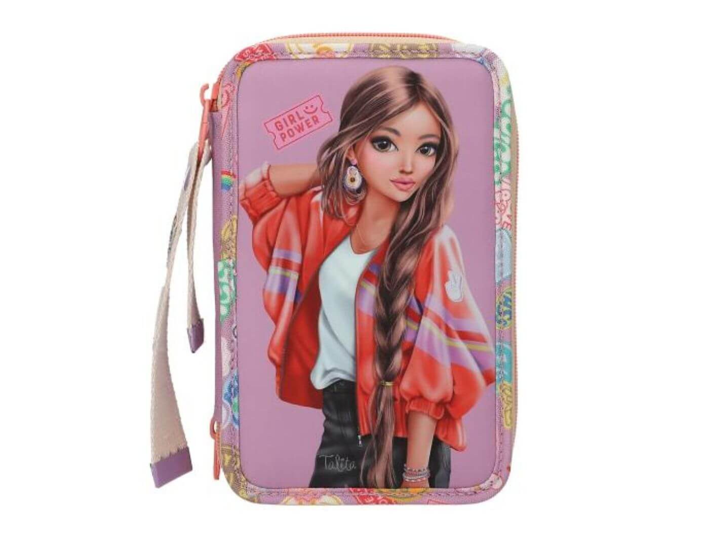 Die lilafarbene Federtasche hat auf der Front ein großes Model-Print. Ein cooler Hingucker sind die vernähten Ränder mit bunten Batch-Prints. Die drei separaten Fächer sind komplett gefüllt mit je 18 Bunt- und Filzstiften, 2 Bleistiften, Anspitzer, Radierer, Schere und einem kleinen Klett-Täschchen. Material: 100 % Polyester