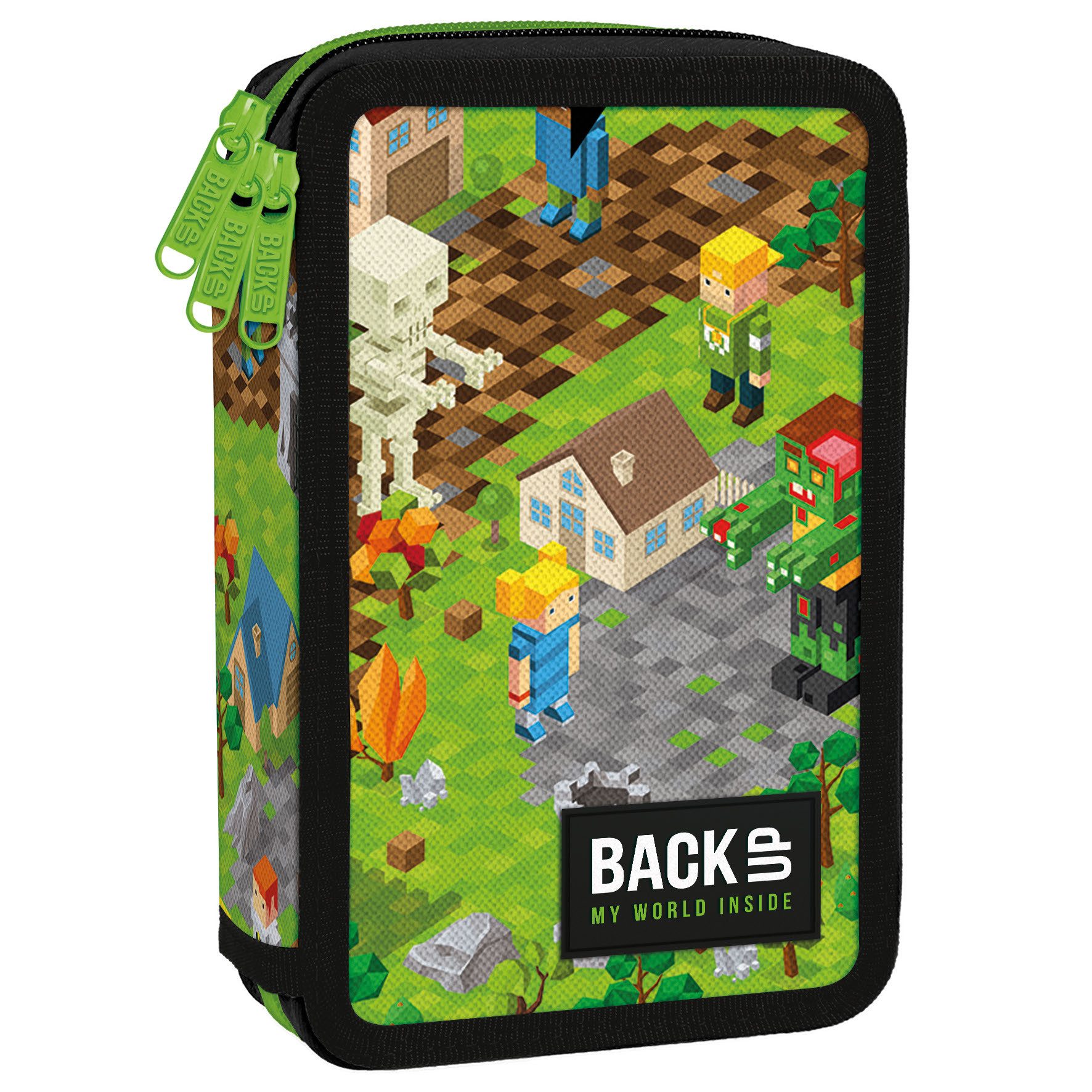 18 Buntstiften, 18 Filzstiften, 1 Radiergummi, 1 Spitzer, 1 Lineal, 3 Kugelschreiber (rot, schwarz und blau), und 1 Bleistift.
