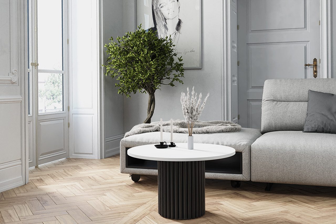 LOMELO – Runder Couchtisch im modernen Design (67x67x42 cm) Stilvoll. Stabil. Vielseitig. Der Couchtisch LOMELO überzeugt durch seine klare Form, hochwertige Materialien und modernes Design. Mit seiner gerillten, säulenartigen Basis ist er nicht nur funktional, sondern auch ein optisches Highlight in jedem Wohnzimmer. Maße: 67 x 67 x 42 cm (Breite x Tiefe x Höhe) Detaillierte Form und Maße finden Sie in der Produktgrafik in der Galerie. Materialien und Ausführung: Gestell: – Metallrohr Ø 25 mm – Pulverbeschichtet in folgenden Farben erhältlich: • Schwarz matt • Weiß matt • Kaschmir Tischplatte: – Melaminbeschichtete Spanplatte, Stärke: 18 mm – Kantenschutz: PVC 0,10 mm – Erhältliche Farben: • Weiß matt • Schwarz matt • Kaschmir Montage: Der Tisch wird zerlegt geliefert. Im Lieferumfang enthalten: – Все benötigten Teile – Detaillierte Montageanleitung Einfacher Aufbau in wenigen Minuten. Eigenschaften: Modernes, elegantes Design Stabile Metallkonstruktion Pflegeleichte Oberflächen Perfekt als Couchtisch oder Beistelltisch Sicher verpackt und einfach zu montieren – ideal auch als Geschenk!