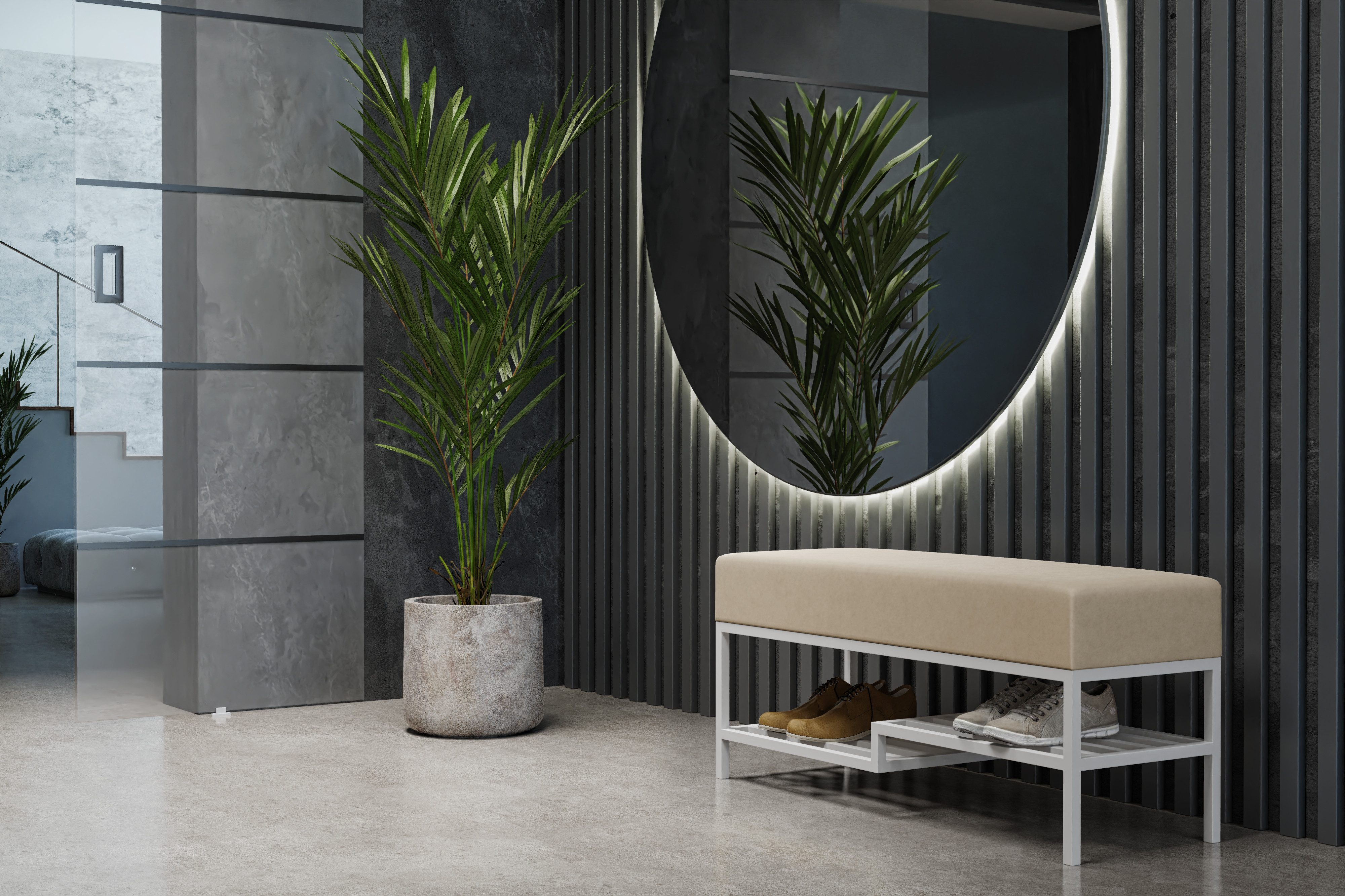 Verleihen Sie Ihrem Zuhause einen Hauch von Eleganz und Funktionalität mit unserer Sitzbank im LOFT DESIGN. Diese moderne, gepolsterte Bank überzeugt durch ihr minimalistisches und industrielles Design, das sich nahtlos in verschiedene Wohnstile einfügt, von skandinavisch bis industrial. Die gepolsterte Sitzfläche, gefertigt aus hochwertigem T30-Schaumstoff und bezogen mit einem strapazierfähigen, leicht zu reinigenden Stoff, bietet höchsten Sitzkomfort. Das stabile Gestell besteht aus pulverbeschichtetem Stahl in einem eleganten Vierkantprofil (20 mm) und ist in vier Farbvarianten erhältlich. Zusätzlich verfügt die Bank über eine praktische Ablage, die ideal für Schuhe oder andere Gegenstände ist, was sie besonders funktional im Flur oder Eingangsbereich macht.