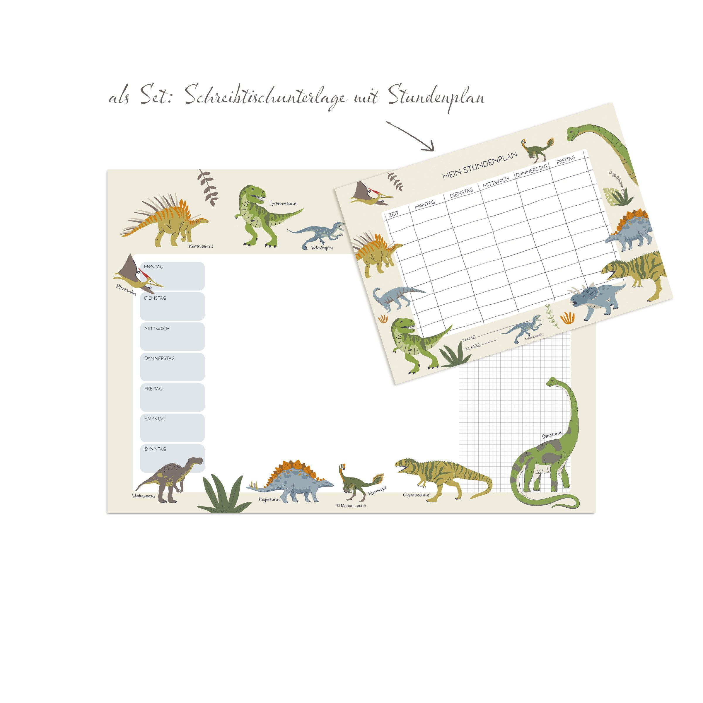 Perfekt für den Schulstart! Entdecke faszinierende Dinosaurier auf einem hochwertigen Wochenplaner/Schreibtischunterlage mit dazu passendem Stundenplan. Durch die Beschriftung der Dinosaurier lernst du ihre Namen kennen. Diese detailliert, gestalteten Produkte helfen deinem Kind einerseits im Handumdrehen Dino Namen zu lernen und anderseits, gleichzeitig den Überblick beim Tagesablauf zu behalten. In der Schulzeit mit Hilfe des übersichtlichen Stundenplans und in der Freizeit mit der Schreibtischunterlage um alles andere, was nicht vergessen werden darf, festzuhalten und zu verstehen. Die freie Fläche kann bestens genützt werden um selbst kleine Kunstwerke zu schaffen. Eine schöne Geschenkidee die ein lebendiges Ambiente im Kinderzimmer schafft, das sowohl praktisch, lernorientiert und dekorativ ist. · Unterlage: 35 x 50cm groß, 25 Blatt Papier 90g · Stundenplan: Din A4 190g · Hochwertig bedruckt, Premiumpapier, sehr gut zum beschreiben · Hergestellt in Deutschland